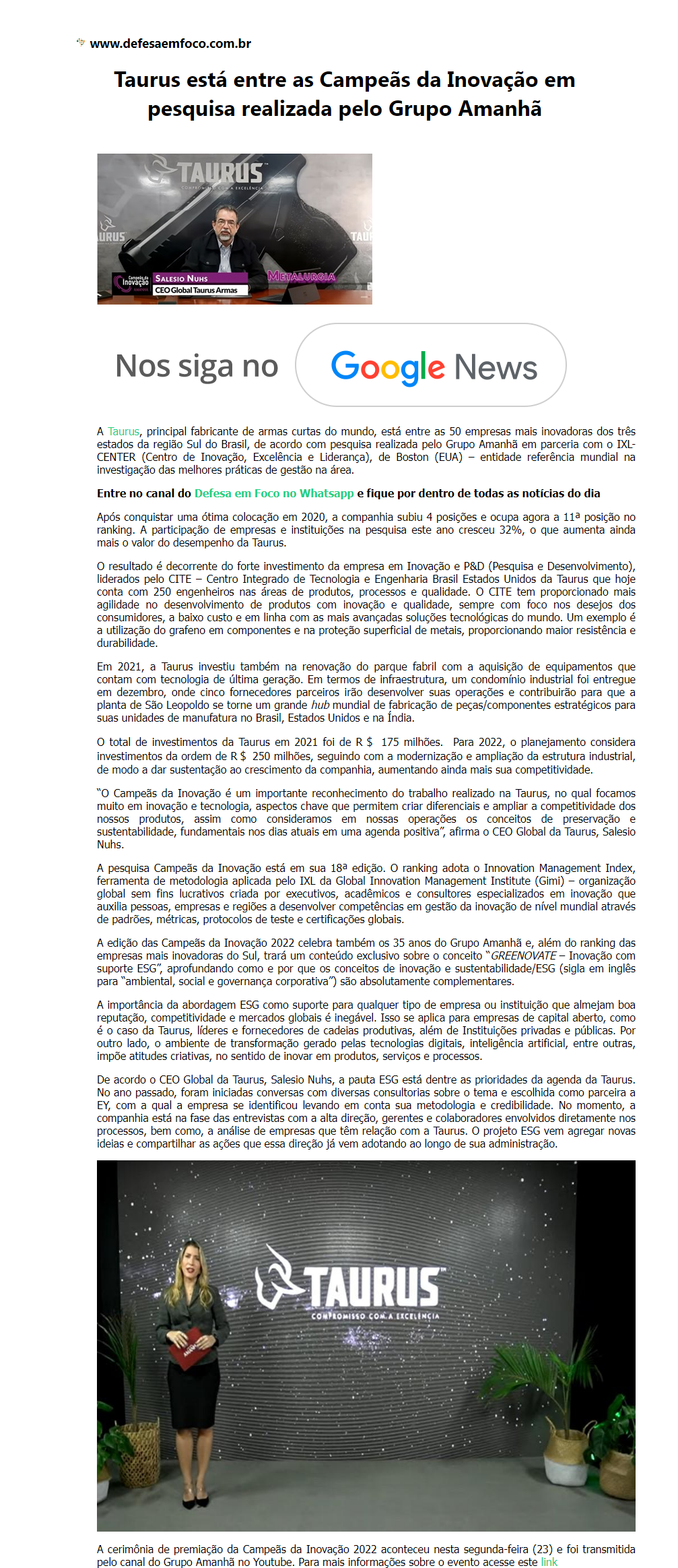 Taurus está entre as Campeãs da Inovação em pesquisa realizada pelo Grupo Amanhã
