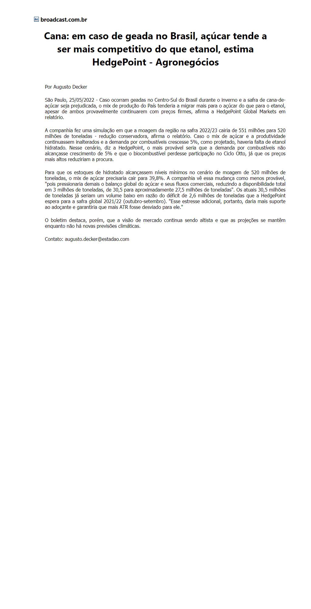 Cana: em caso de geada no Brasil, açúcar tende a ser mais competitivo do que etanol, estima HedgePoint - Agronegócios