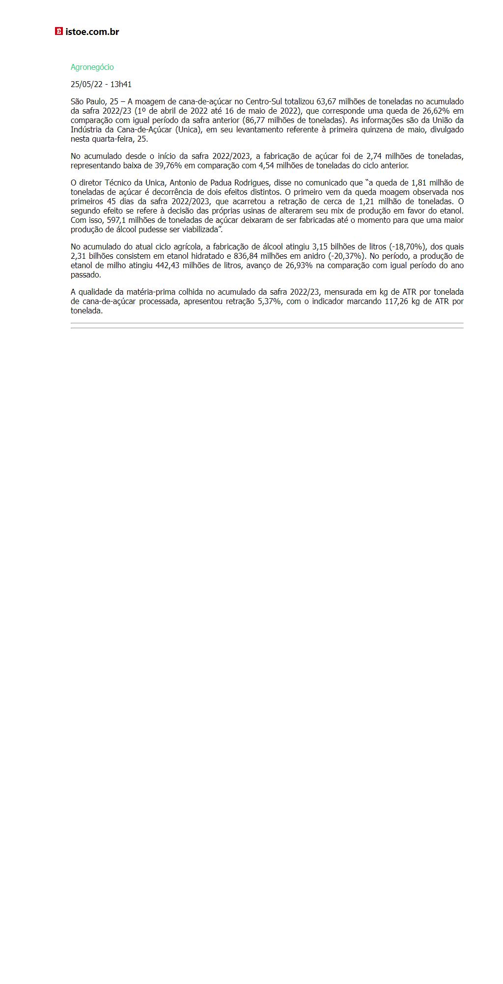 Moagem acumulada de cana no Centro-Sul na safra 2022/23 cai 26,62% ante 2021/22