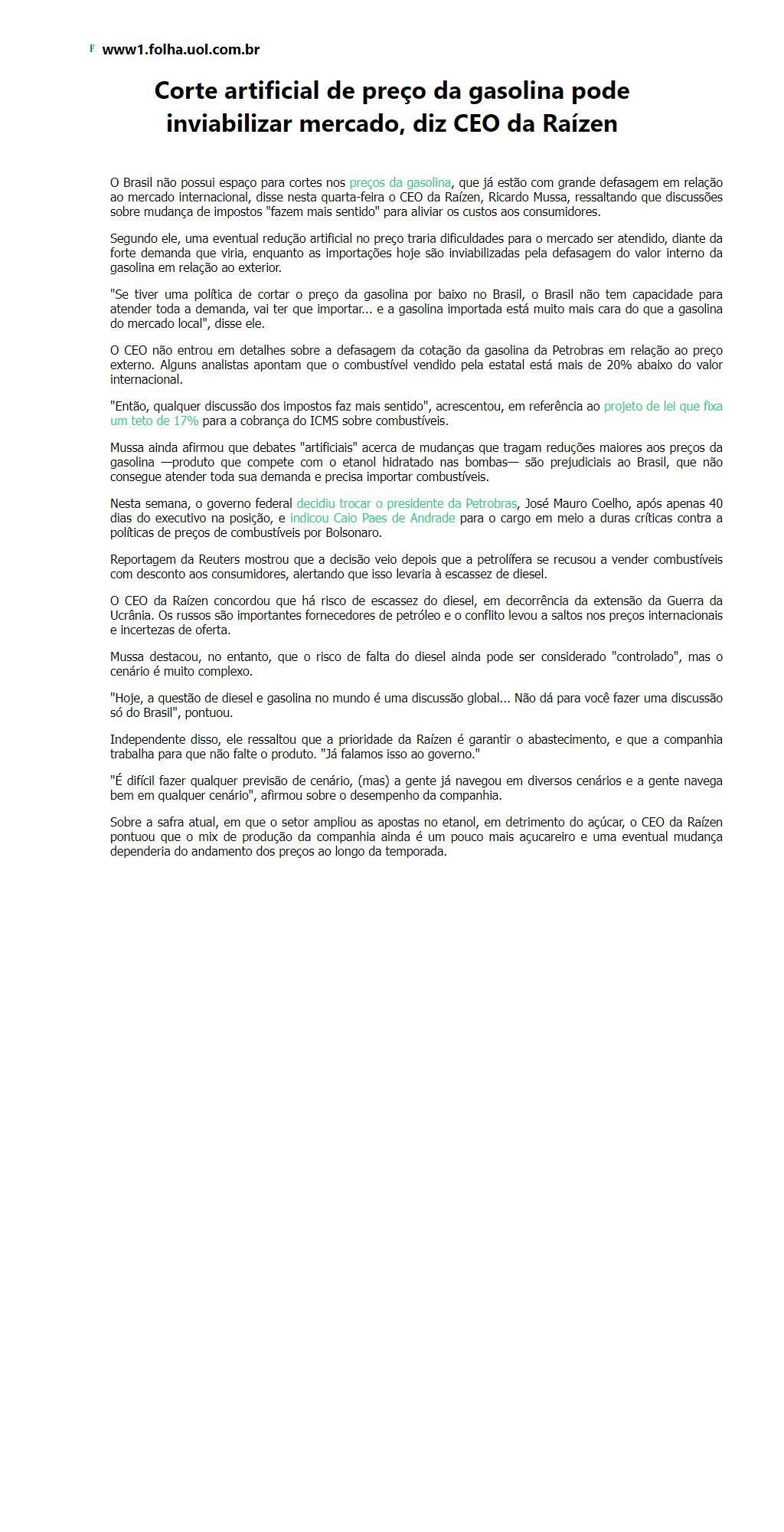 Corte artificial de preço da gasolina pode inviabilizar mercado, diz CEO da Raízen