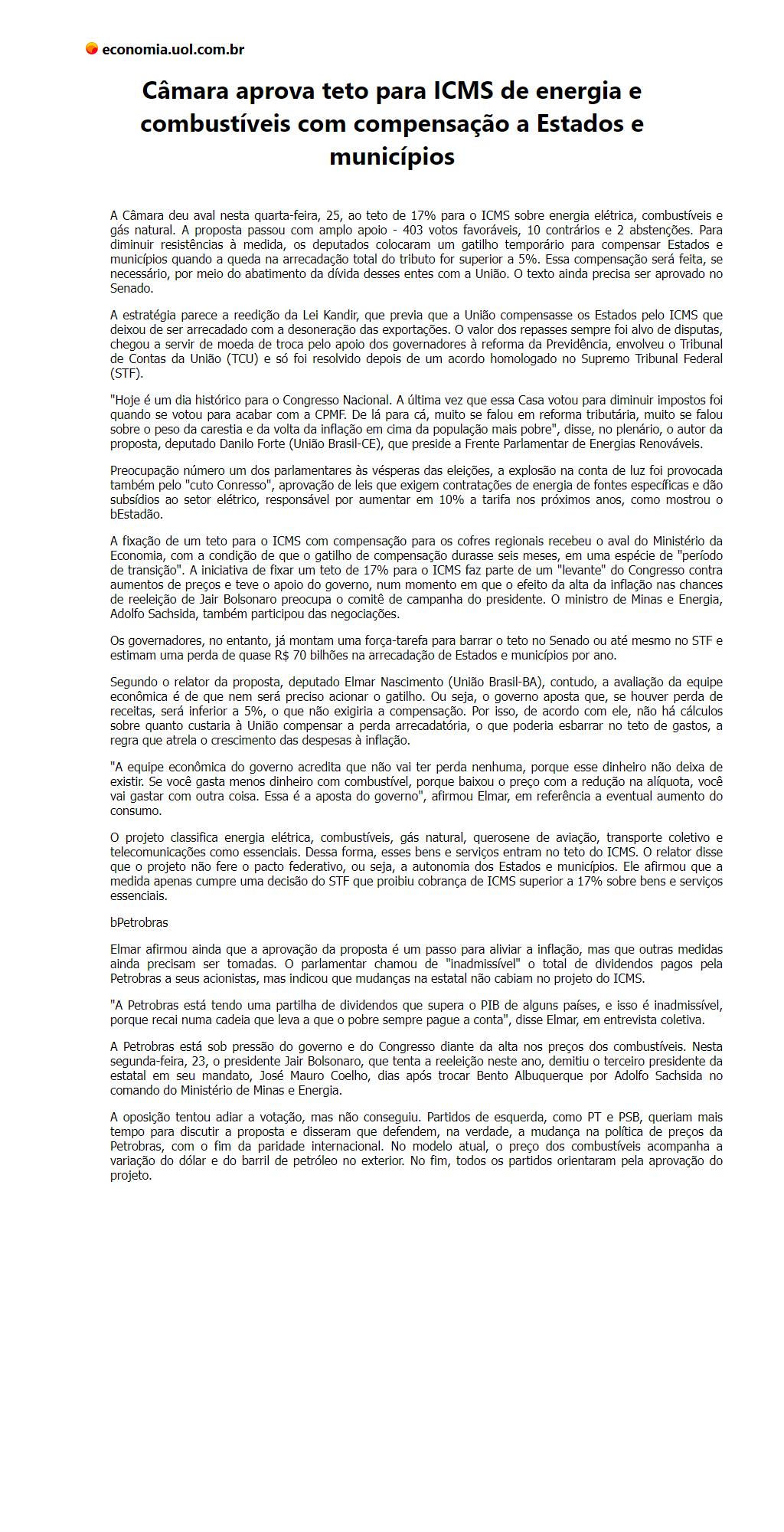 Câmara aprova teto para ICMS de energia e combustíveis com compensação a Estados e municípios