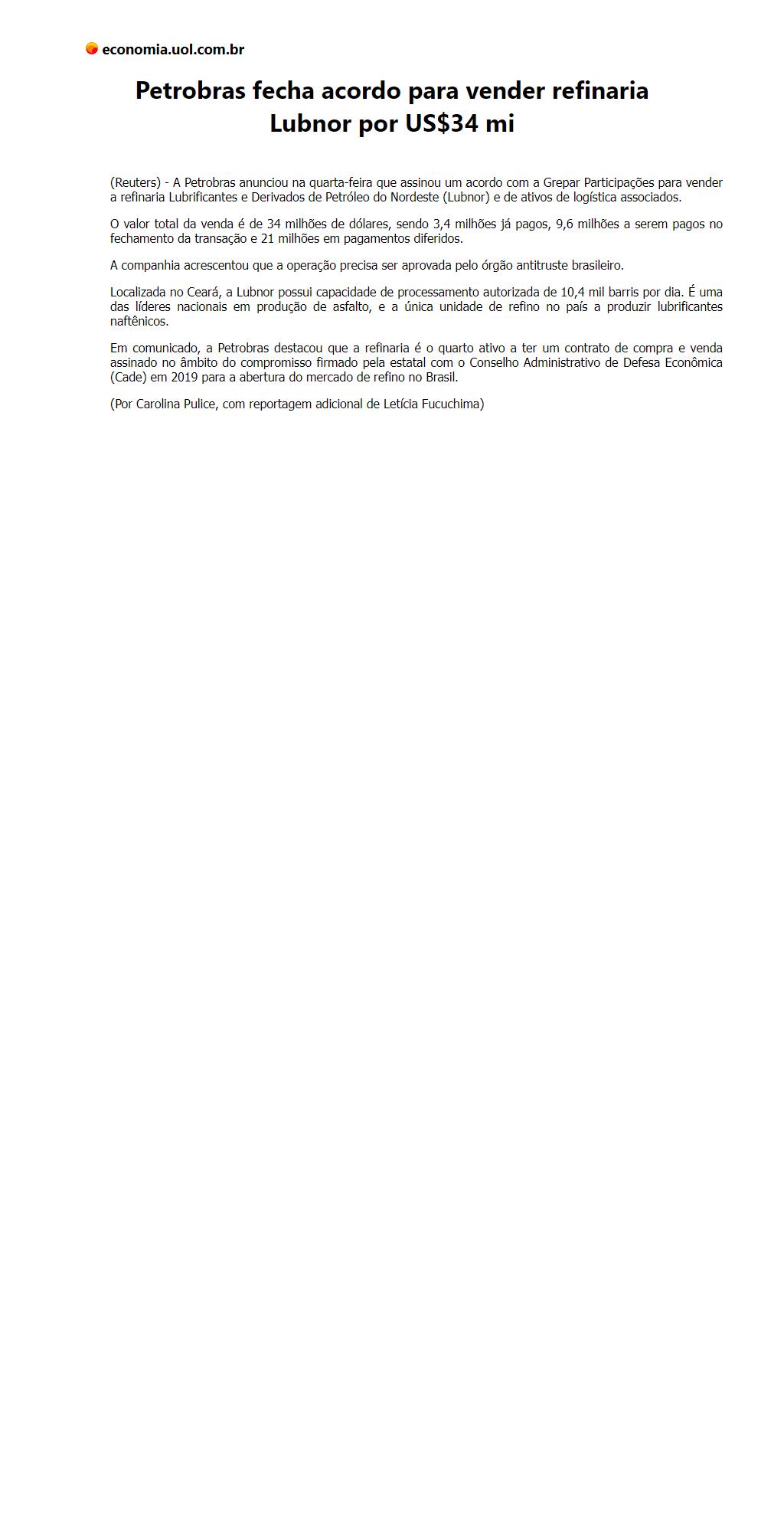 Petrobras fecha acordo para vender refinaria Lubnor por US$34 mi