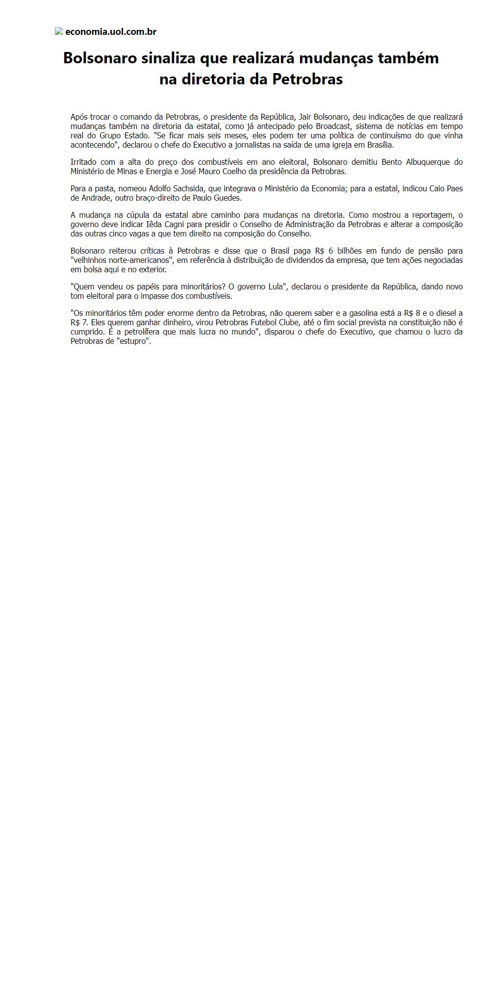Bolsonaro sinaliza que realizará mudanças também na diretoria da Petrobras