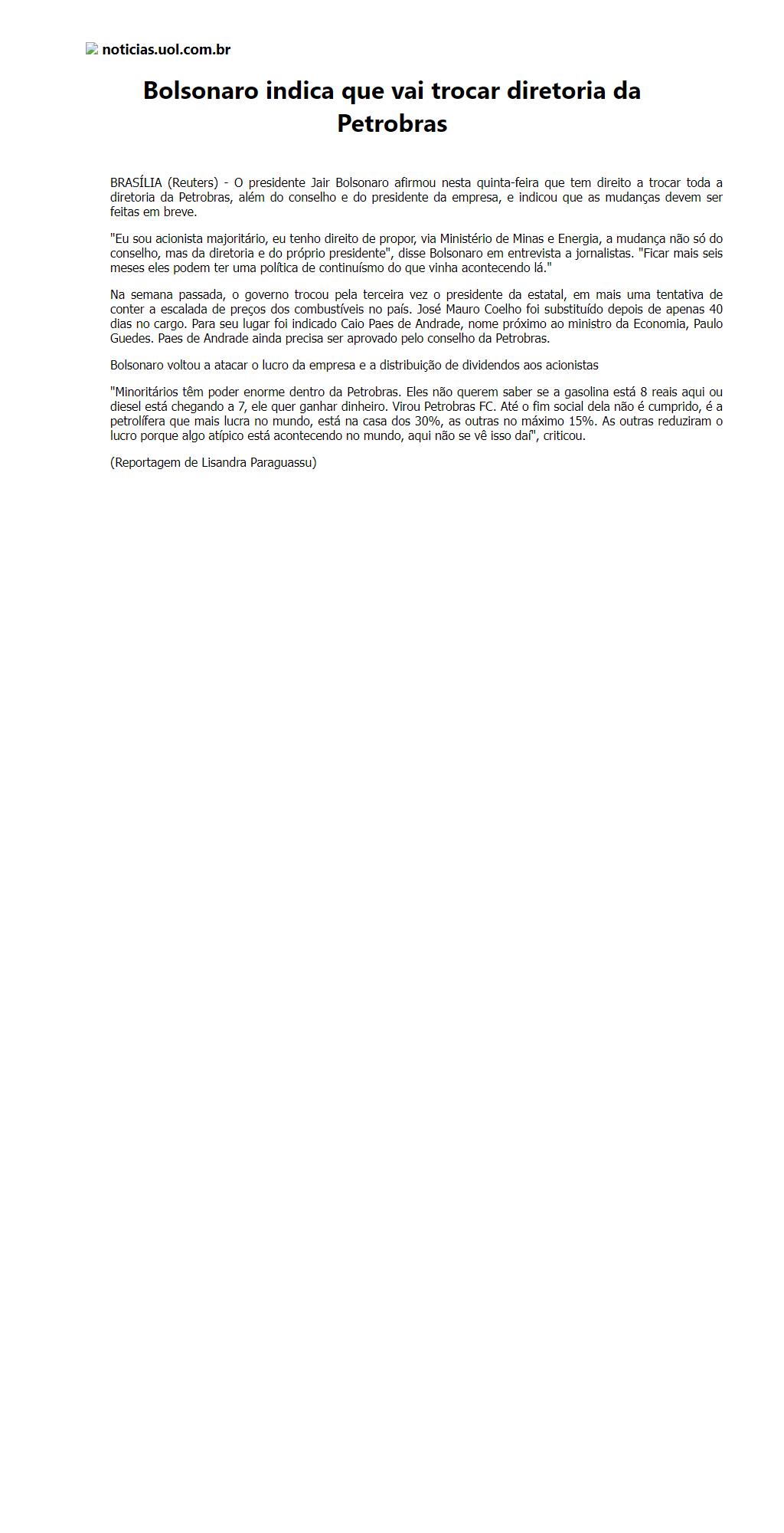 Bolsonaro indica que vai trocar diretoria da Petrobras