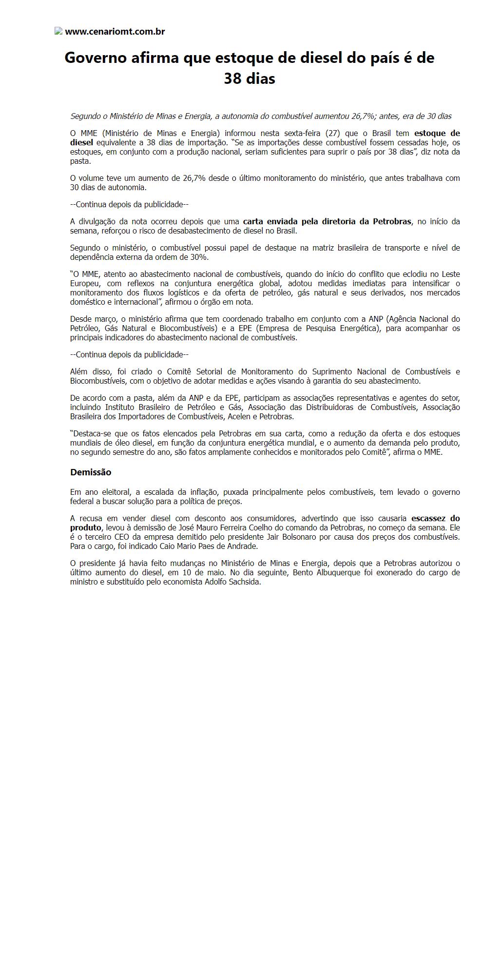 Governo afirma que estoque de diesel do país é de 38 dias