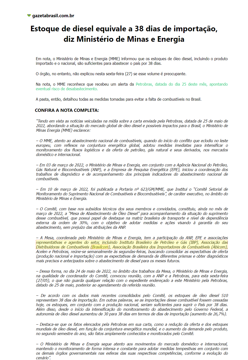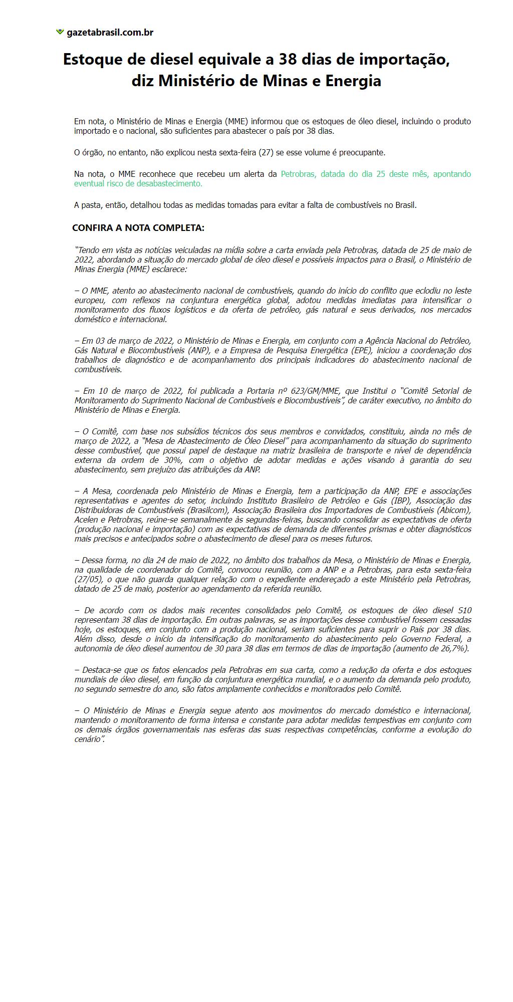 Estoque de diesel equivale a 38 dias de importação, diz Ministério de Minas e Energia