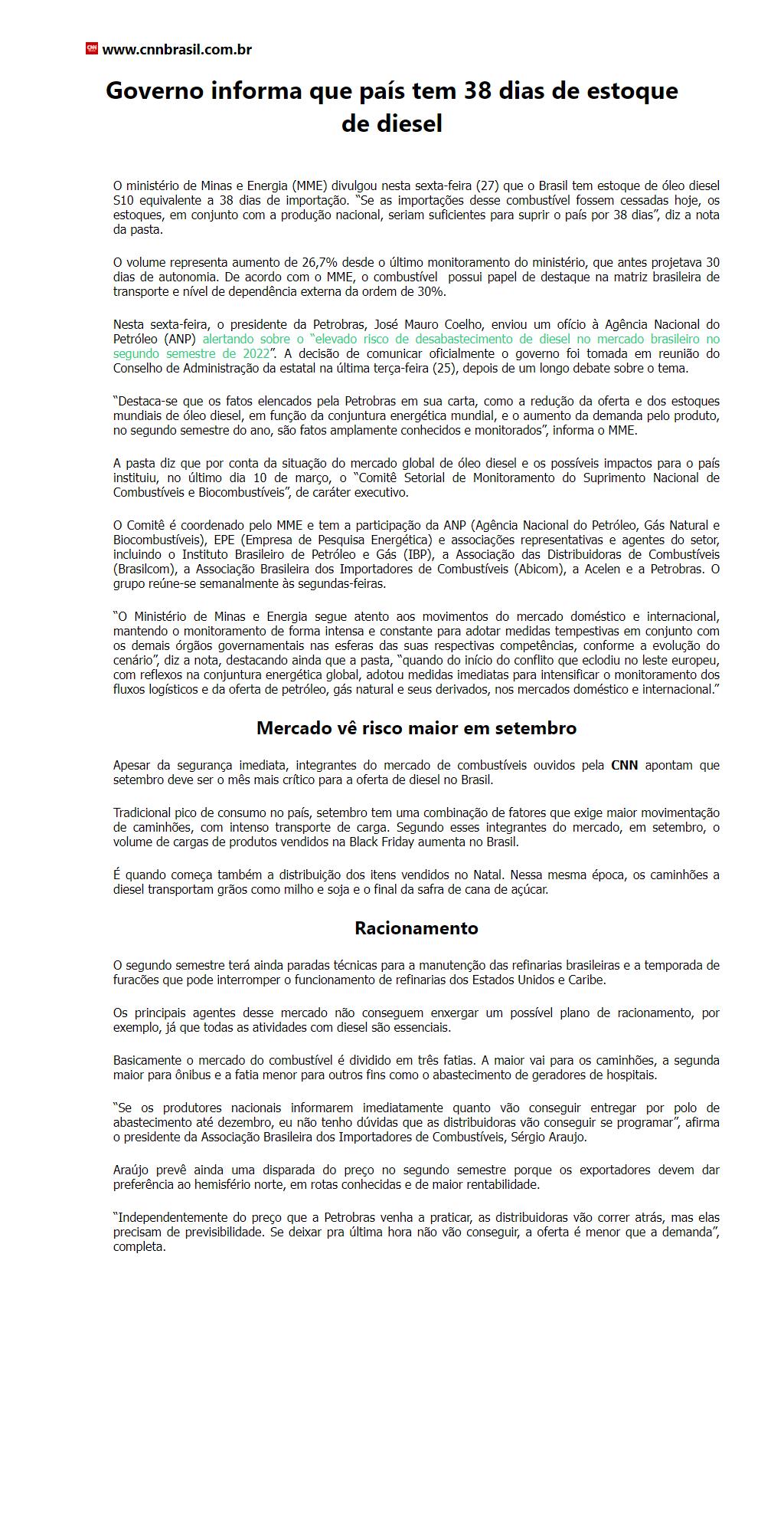 Governo informa que país tem 38 dias de estoque de diesel