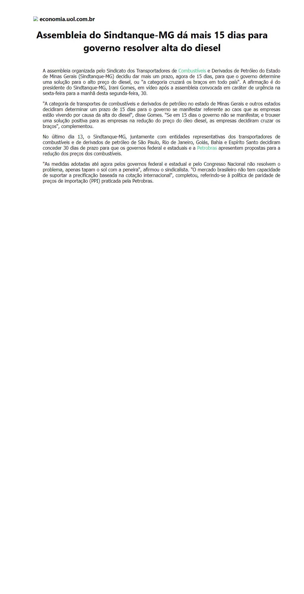 Assembleia do Sindtanque-MG dá mais 15 dias para governo resolver alta do diesel