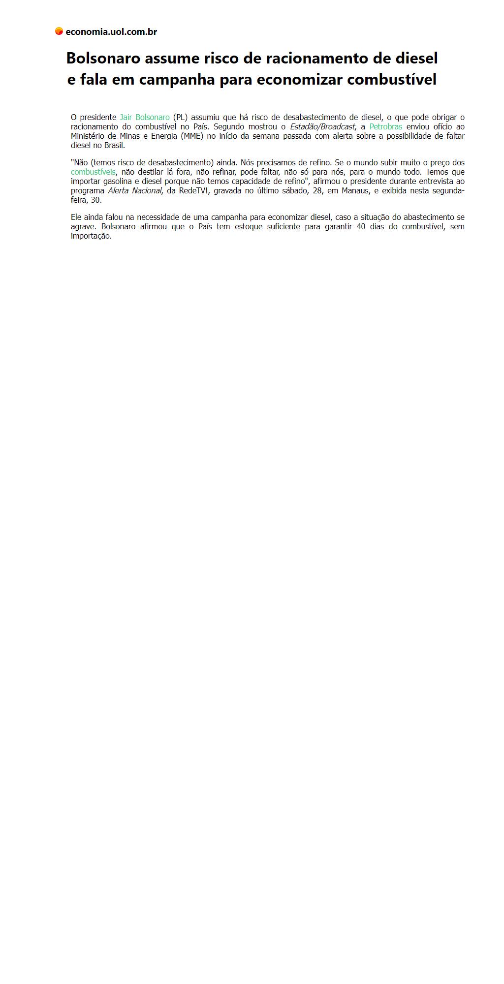 Bolsonaro assume risco de racionamento de diesel e fala em campanha para economizar combustível