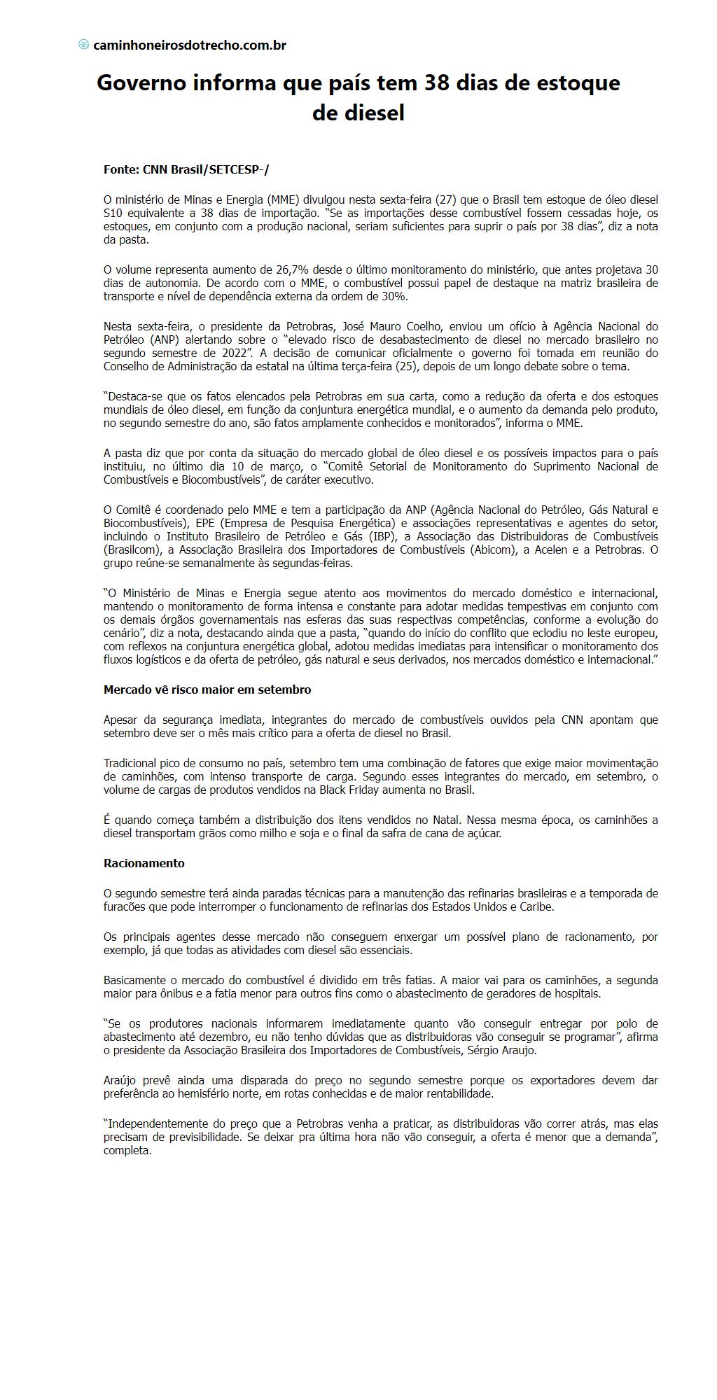 Governo informa que país tem 38 dias de estoque de diesel