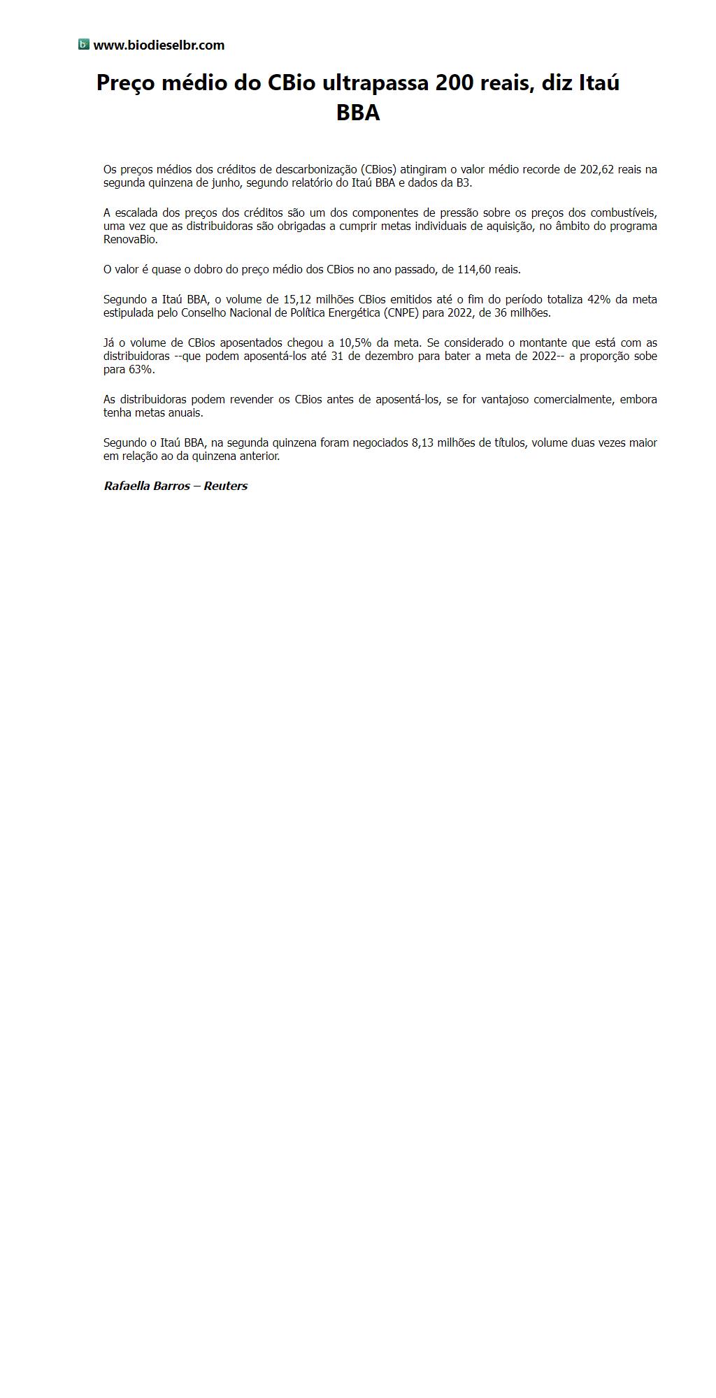 Preço médio do CBio ultrapassa 200 reais, diz Itaú BBA
