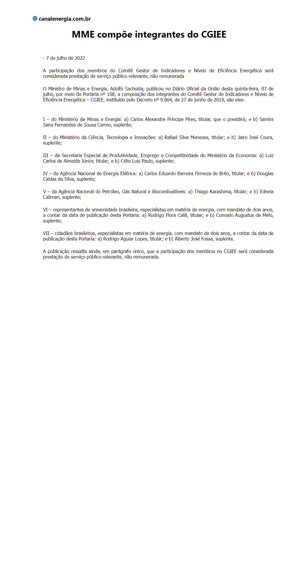 MME compõe integrantes do CGIEE