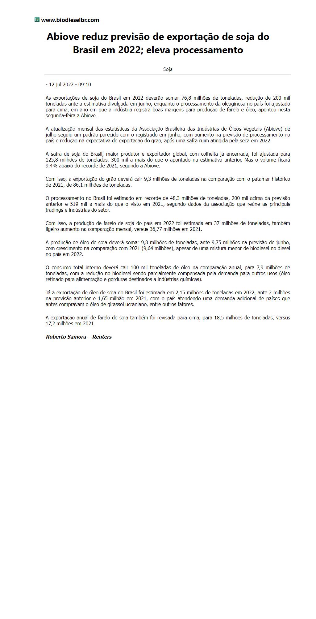 Abiove reduz previsão de exportação de soja do Brasil em 2022; eleva processamento