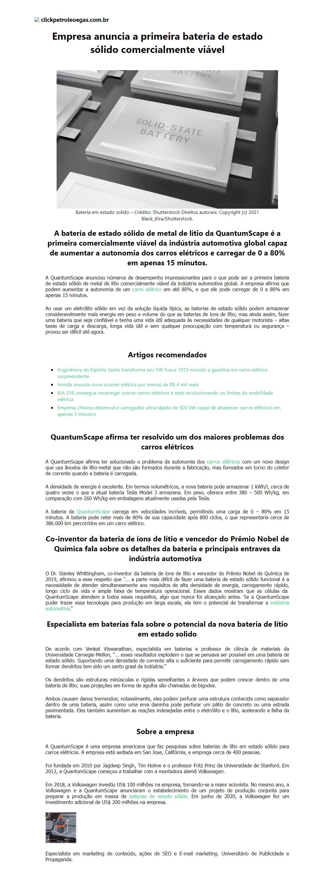Empresa anuncia a primeira bateria de estado sólido comercialmente viável