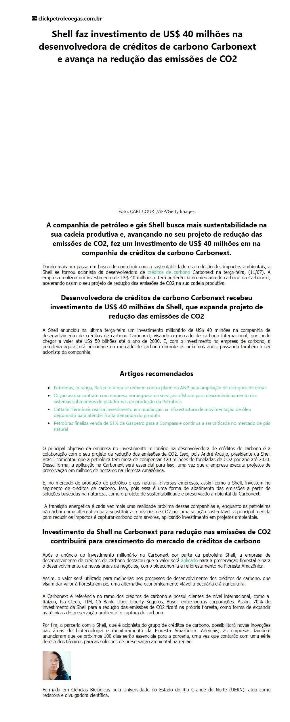 Shell faz investimento de US$ 40 milhões na desenvolvedora de créditos de carbono Carbonext e avança na redução das emis