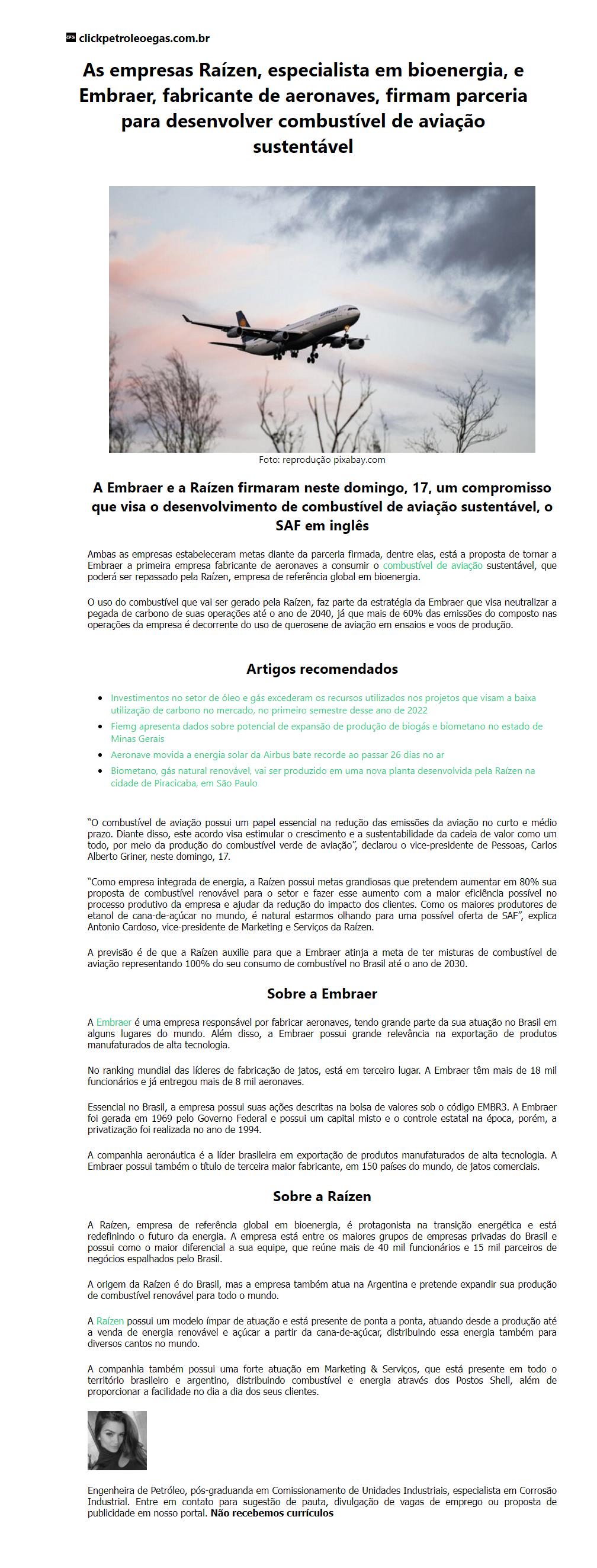 As empresas Raízen, especialista em bioenergia, e Embraer, fabricante de aeronaves, firmam parceria para desenvolver com