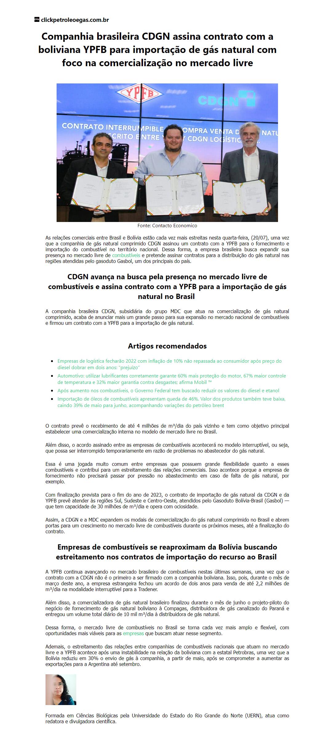 Companhia brasileira CDGN assina contrato com a boliviana YPFB para importação de gás natural com foco na comercializaçã