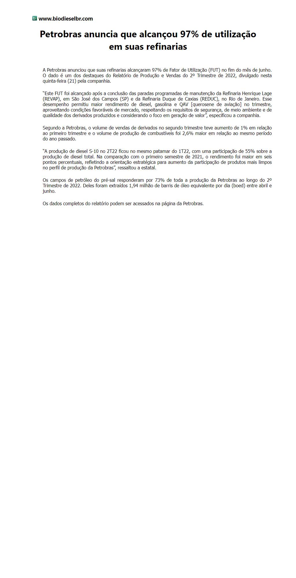 Petrobras anuncia que alcançou 97% de utilização em suas refinarias