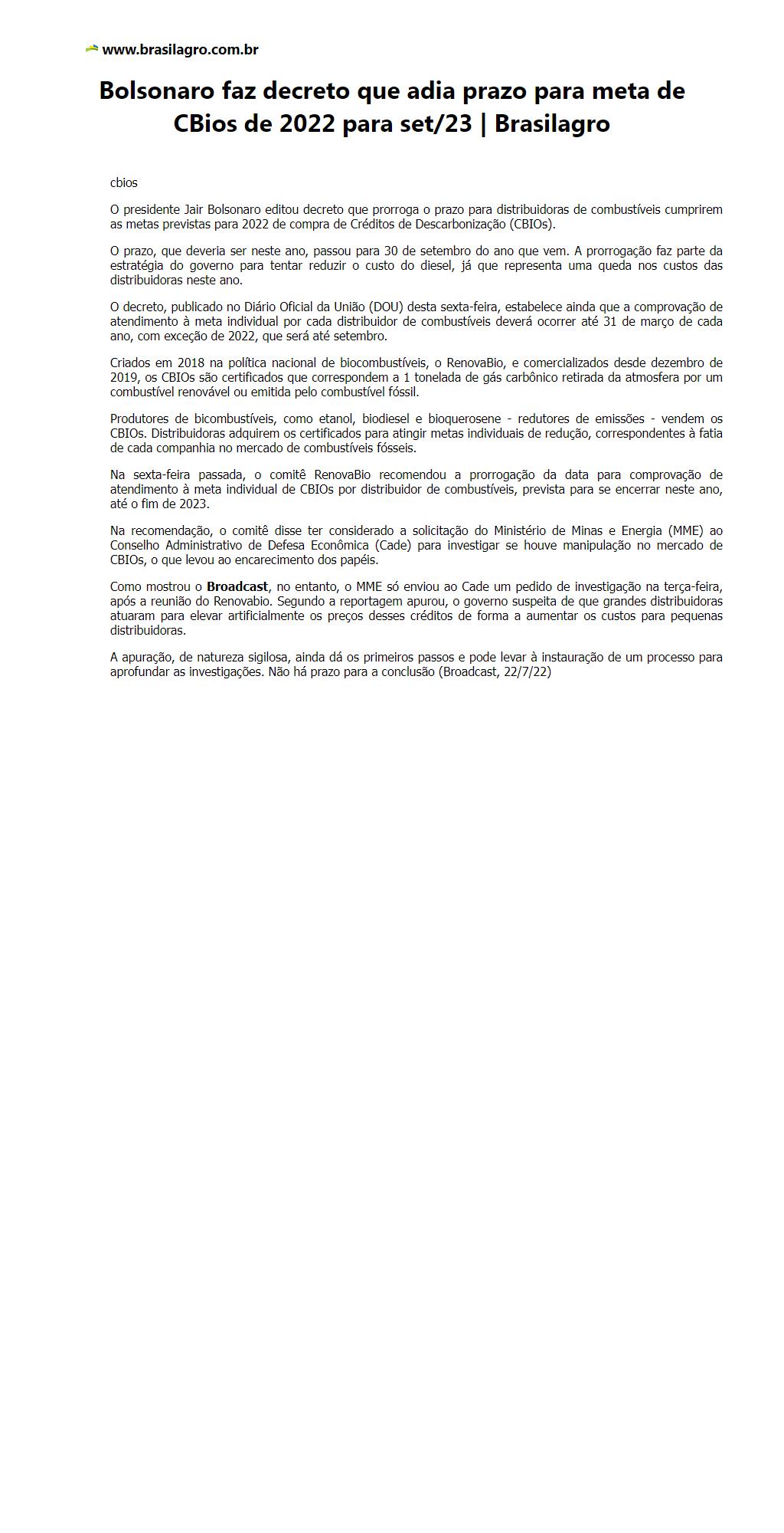 Bolsonaro faz decreto que adia prazo para meta de CBios de 2022 para set/23