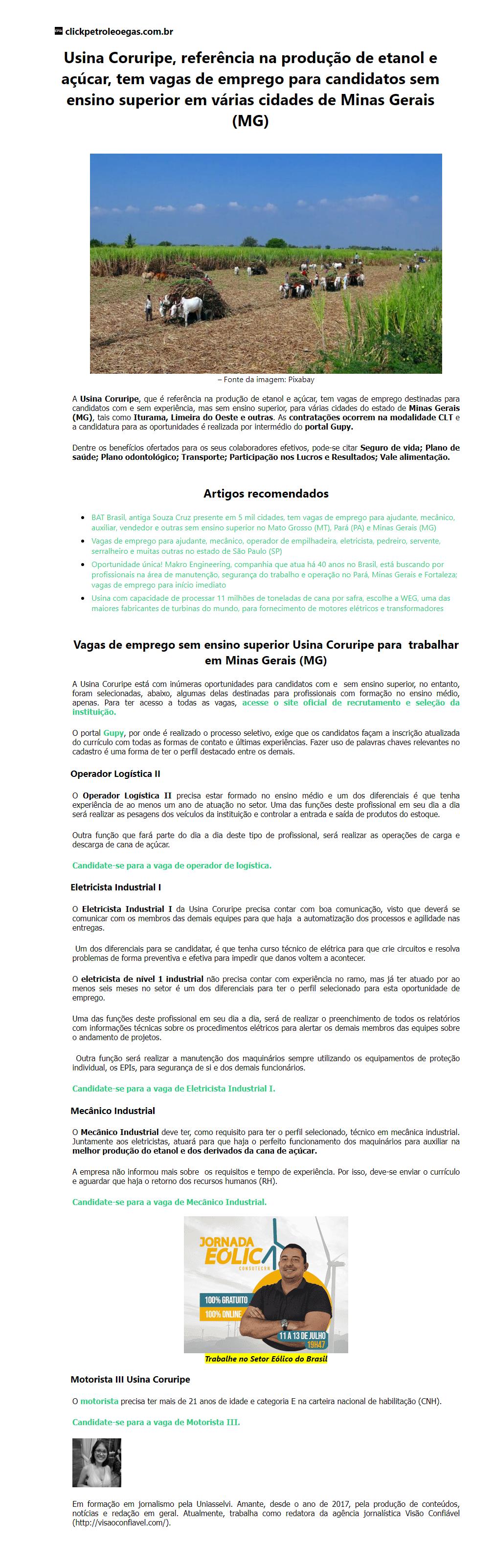 Usina Coruripe, referência na produção de etanol e açúcar, tem vagas de emprego para candidatos sem ensino superior em v