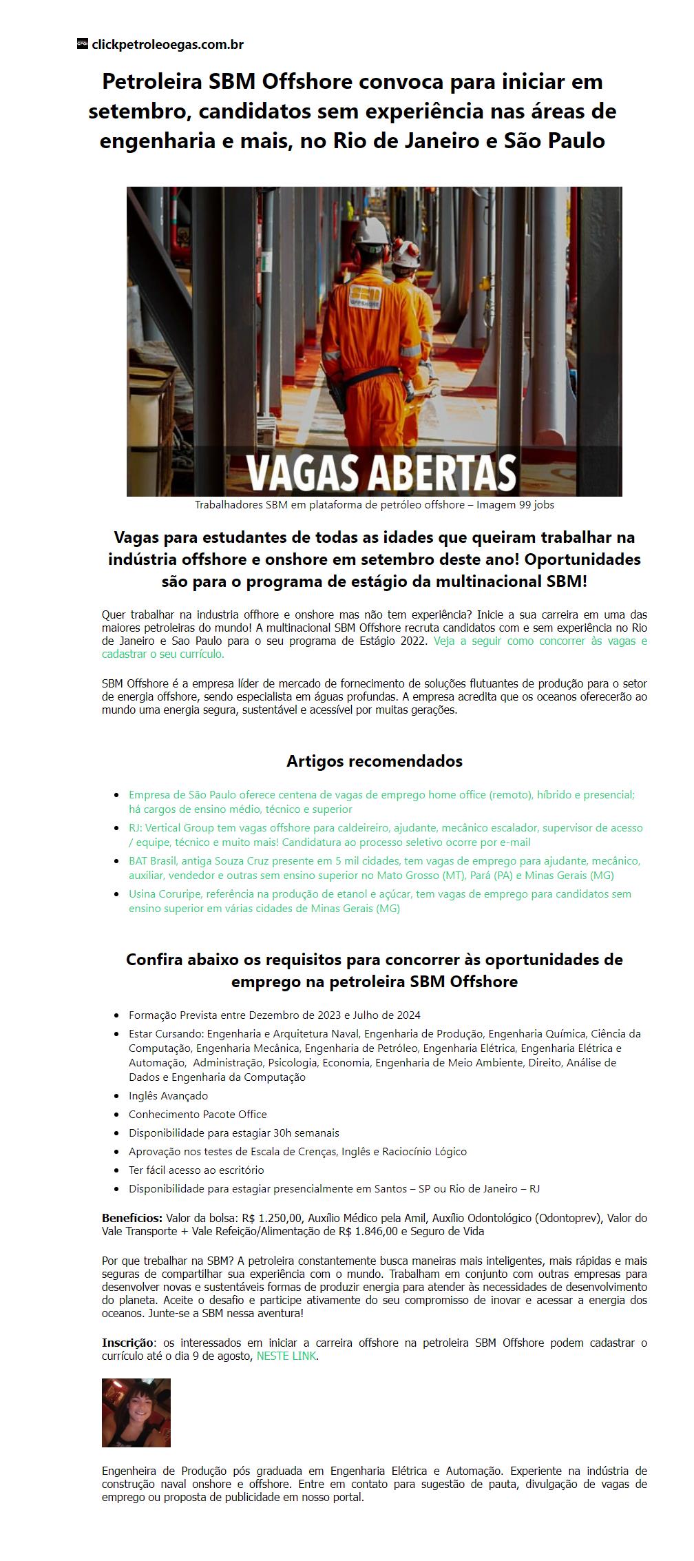 Petroleira SBM Offshore convoca para iniciar em setembro, candidatos sem experiência nas áreas de engenharia e mais, no