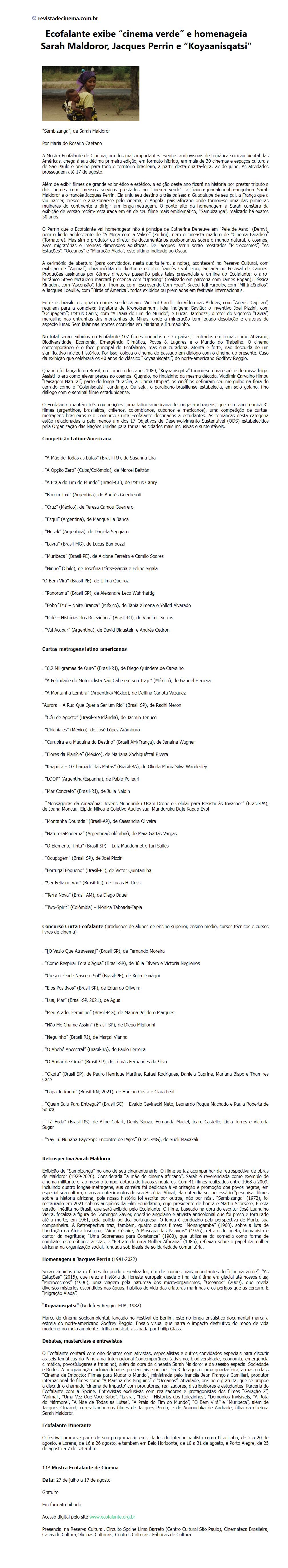 Ecofalante exibe cinema verde e homenageia Sarah Maldoror, Jacques Perrin e Koyaanisqatsi
