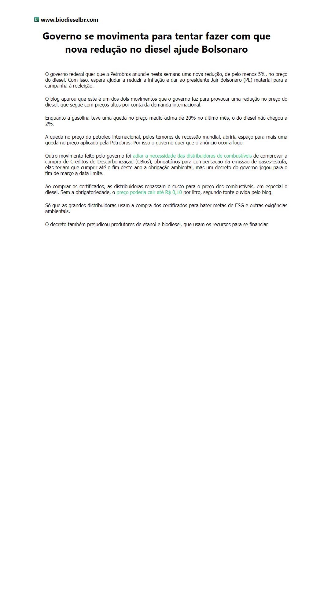 Governo se movimenta para tentar fazer com que nova redução no diesel ajude Bolsonaro
