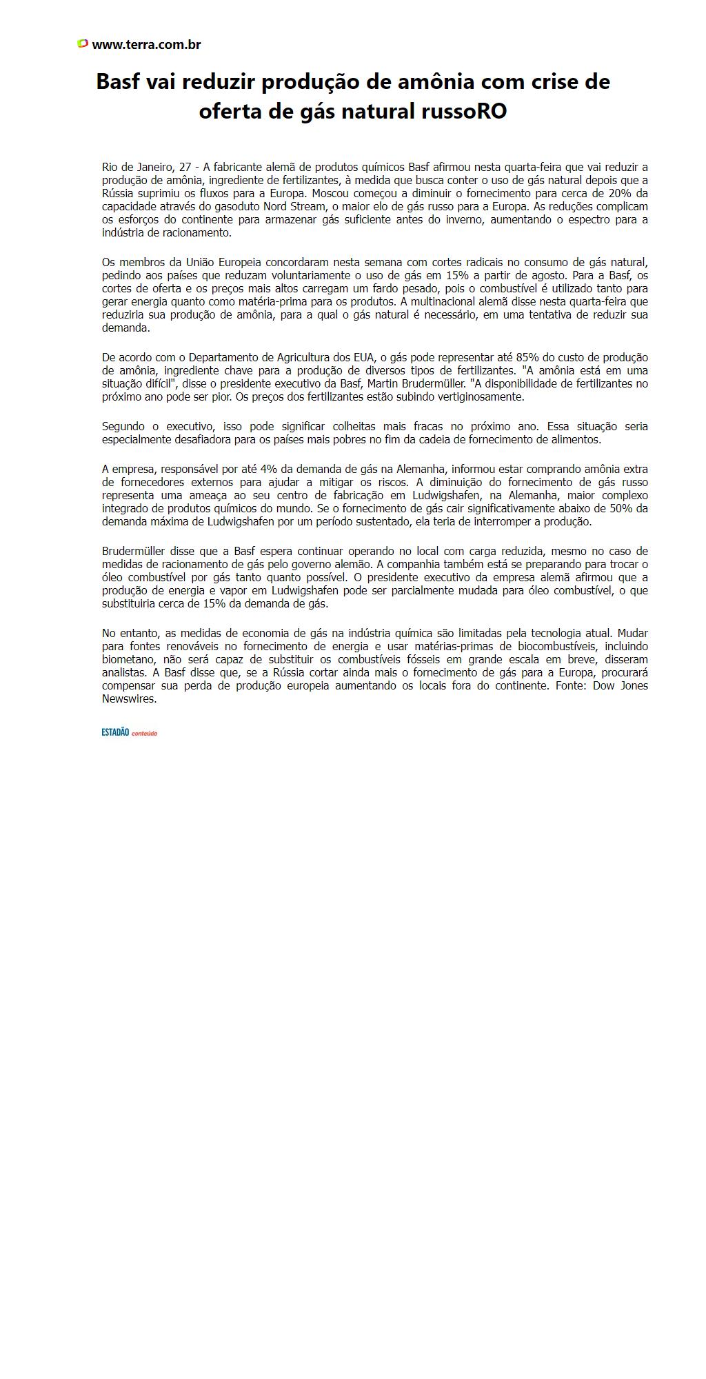 Basf vai reduzir produção de amônia com crise de oferta de gás natural russoRO