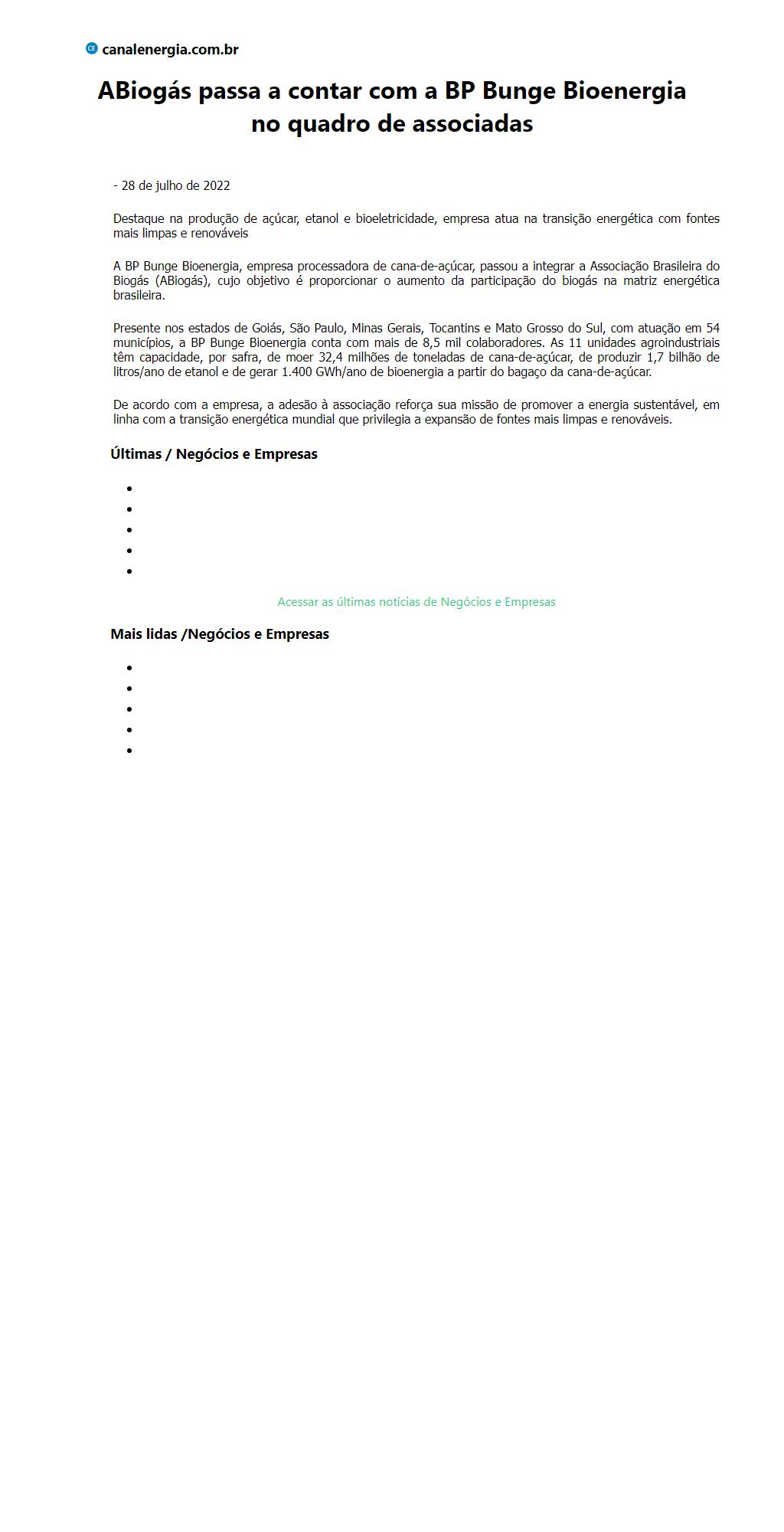 ABiogás passa a contar com a BP Bunge Bioenergia no quadro de associadas