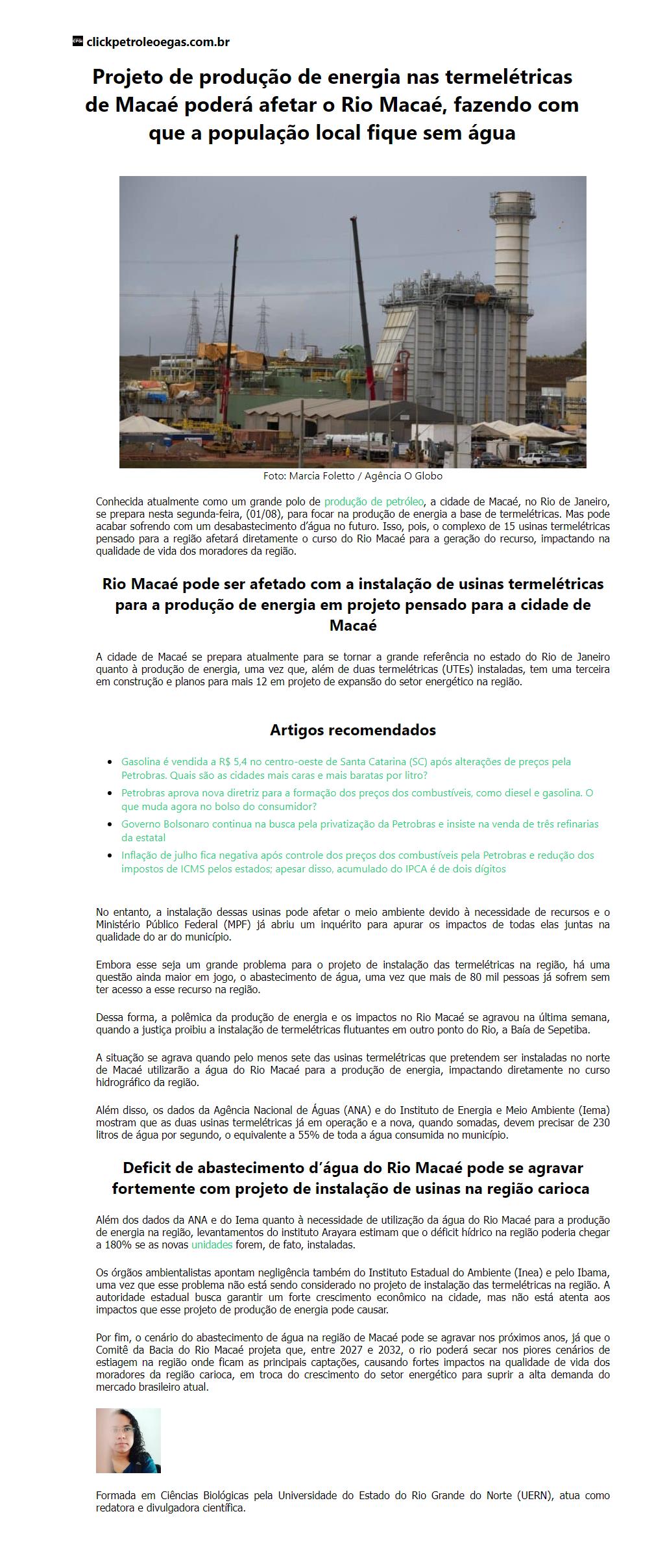 Projeto de produção de energia nas termelétricas de Macaé poderá afetar o Rio Macaé, fazendo com que a população local f