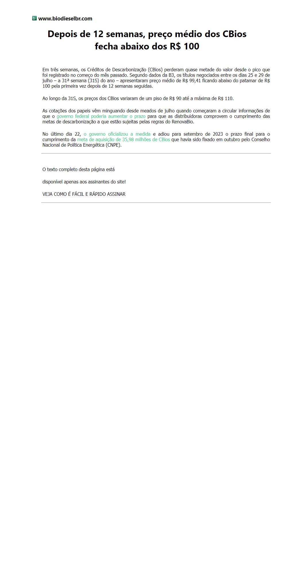 Depois de 12 semanas, preço médio dos CBios fecha abaixo dos R$ 100