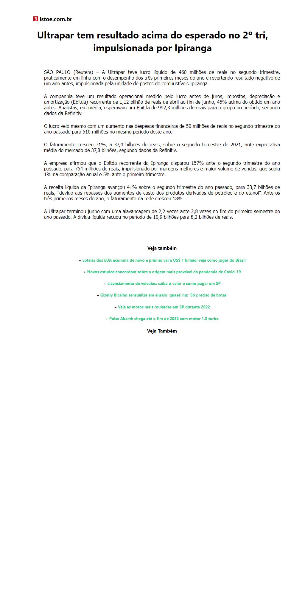 Ultrapar tem resultado acima do esperado no 2º tri, impulsionada por Ipiranga