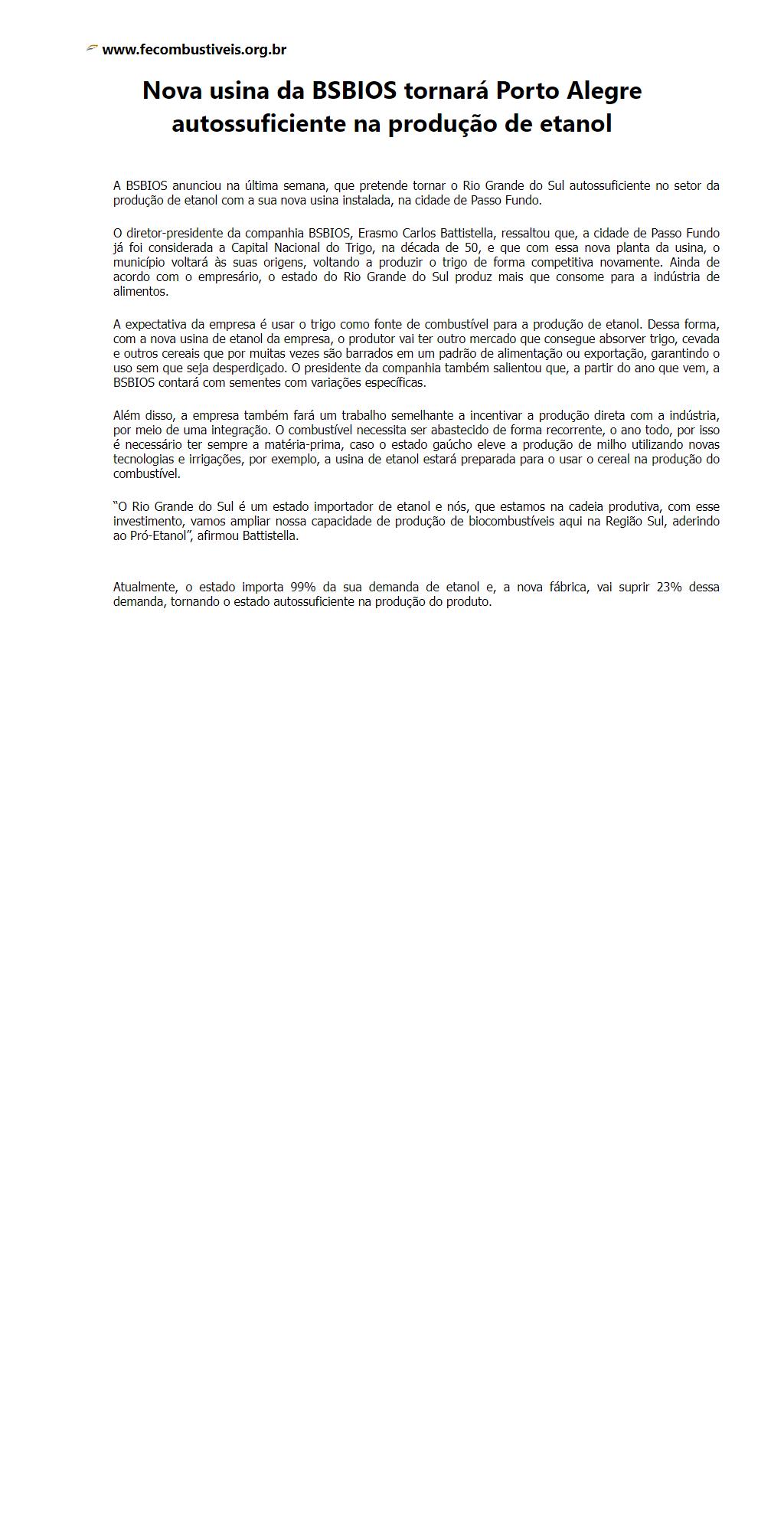 Nova usina da BSBIOS tornará Porto Alegre autossuficiente na produção de etanol
