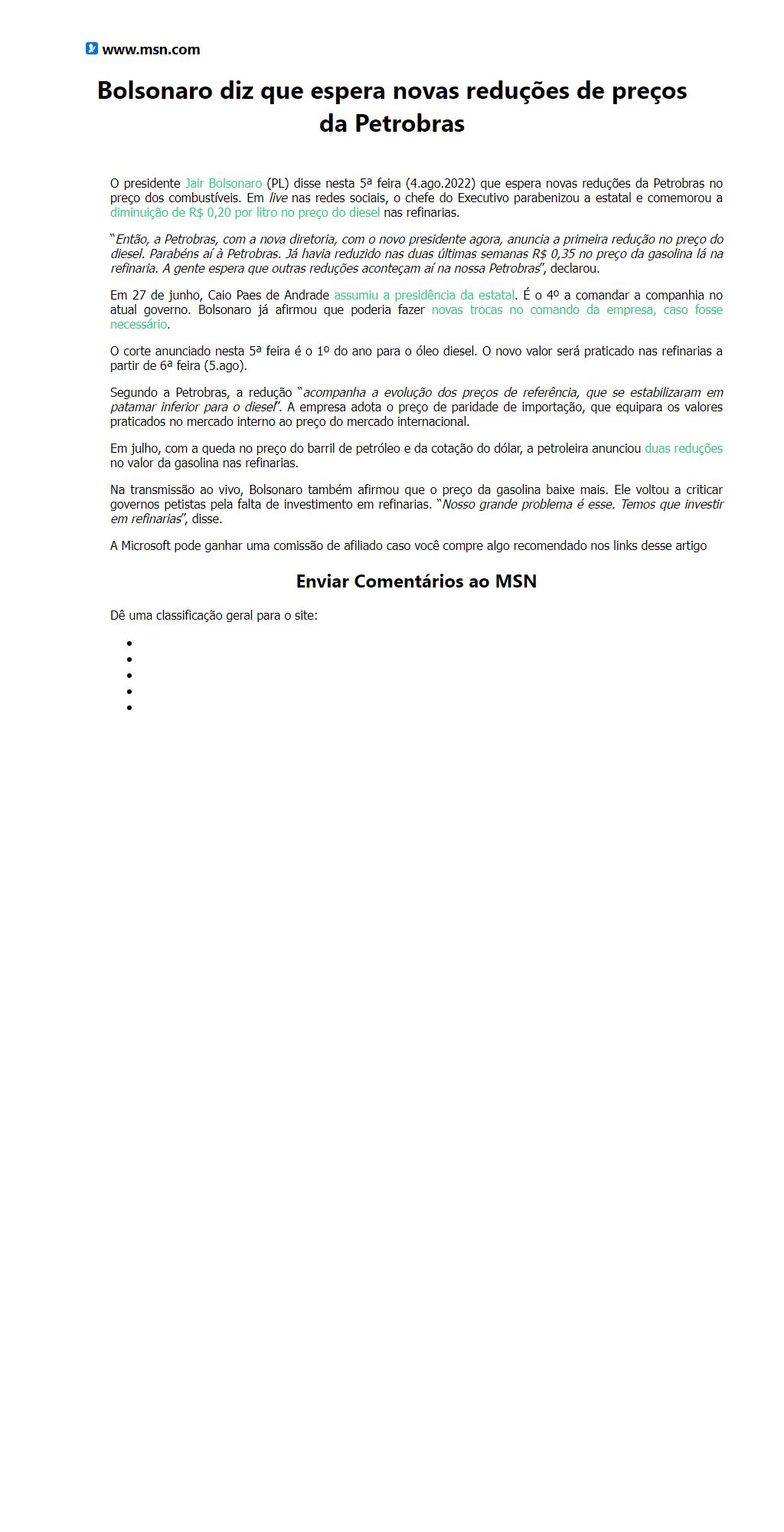 Bolsonaro diz que espera novas reduções de preços da Petrobras