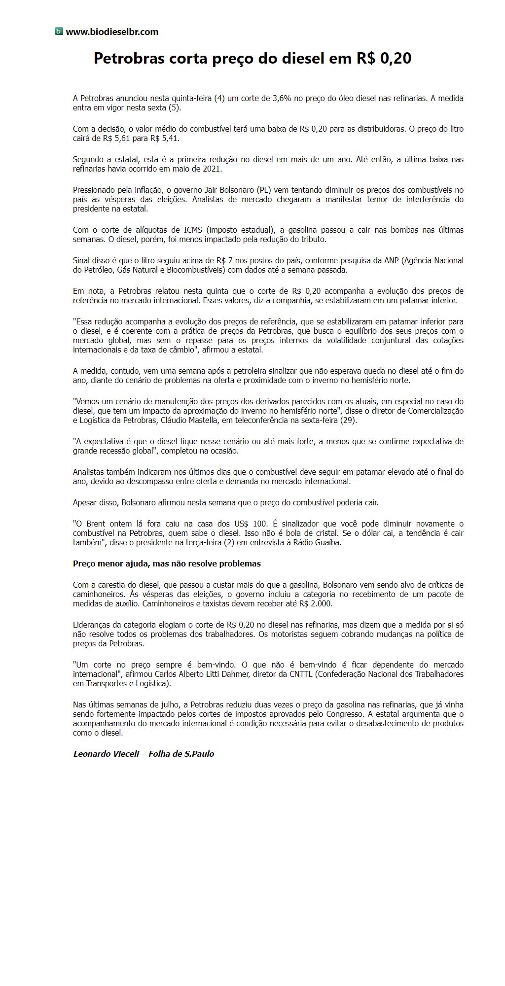 Petrobras corta preço do diesel em R$ 0,20
