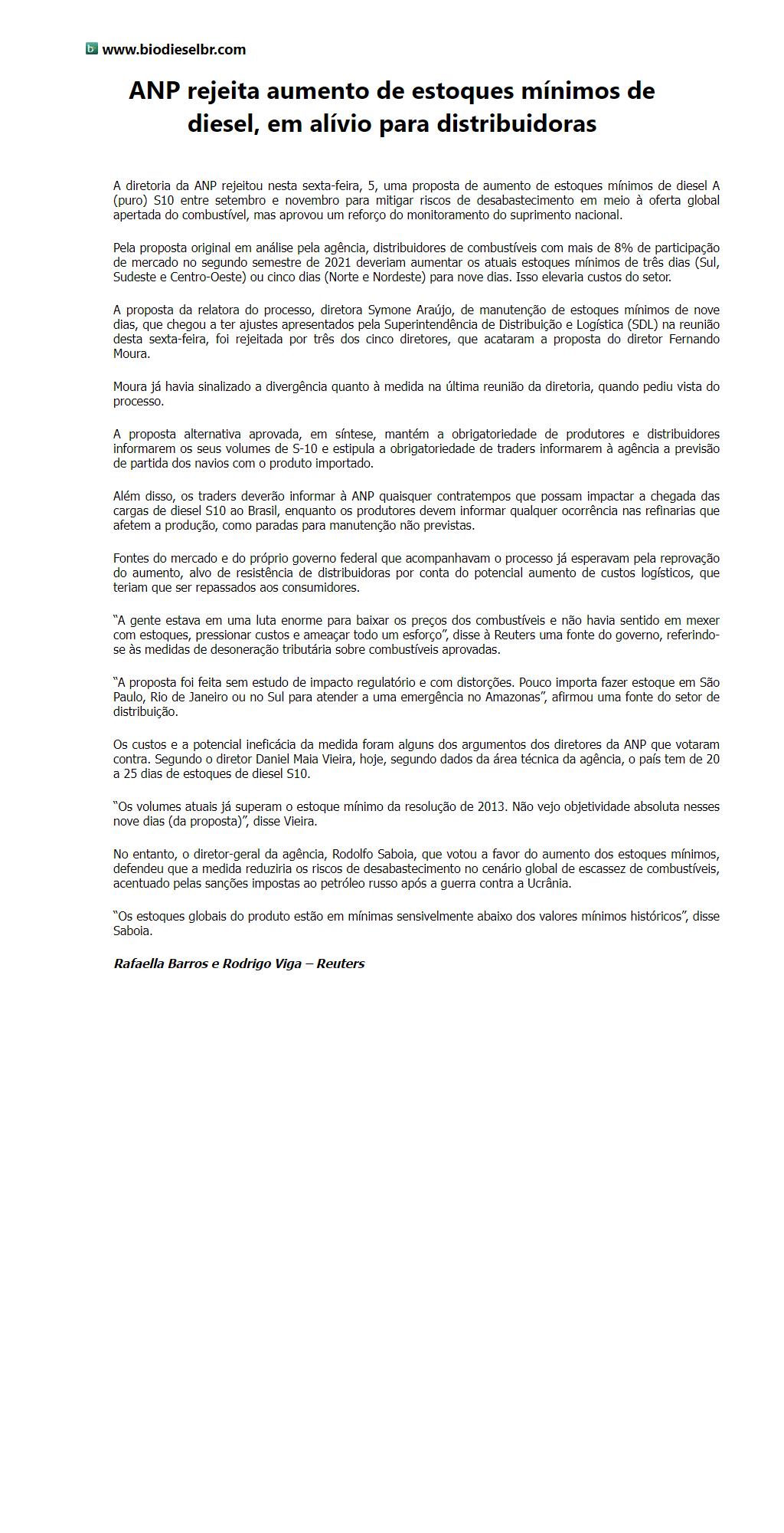 ANP rejeita aumento de estoques mínimos de diesel, em alívio para distribuidoras