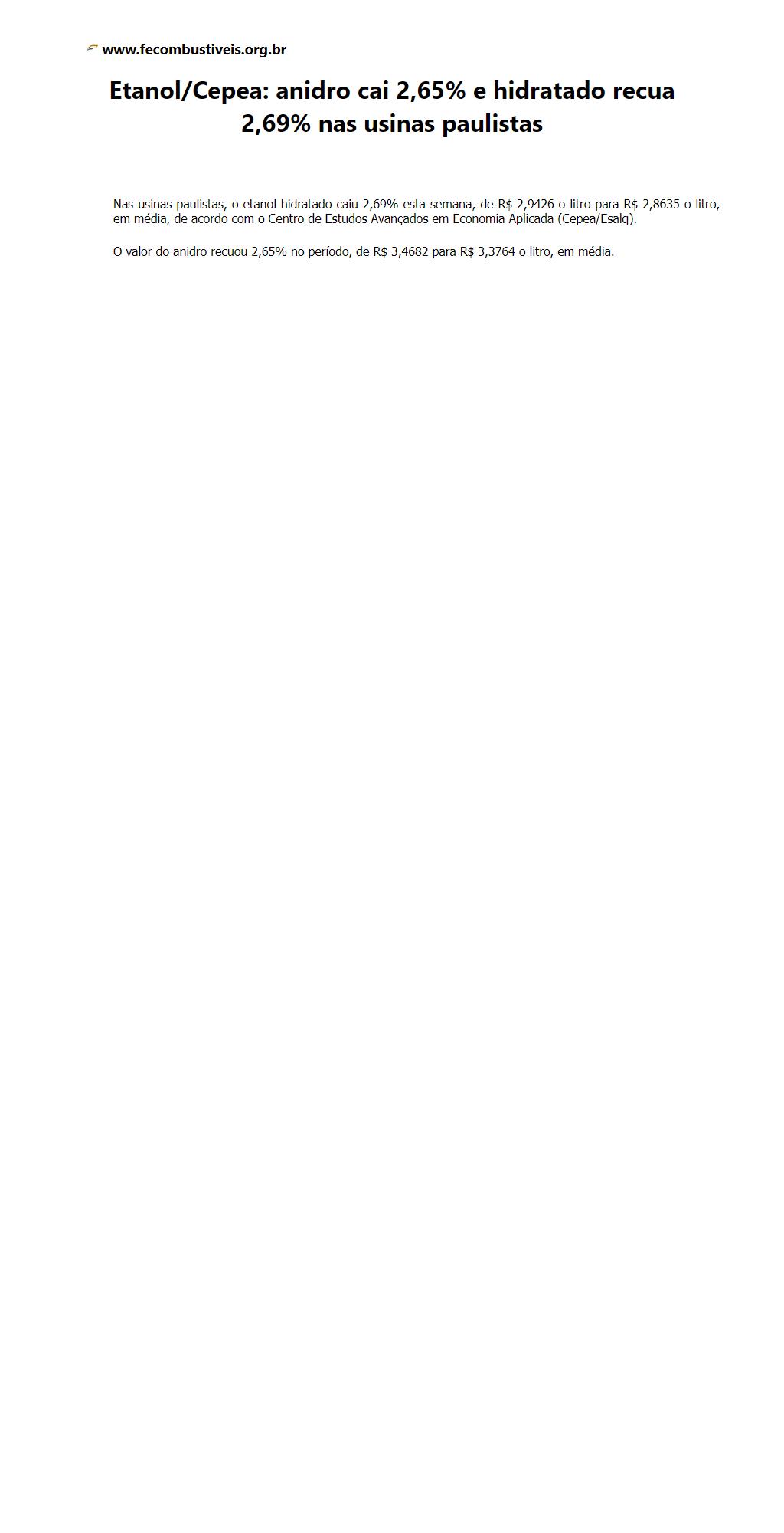 Etanol/Cepea: anidro cai 2,65% e hidratado recua 2,69% nas usinas paulistas