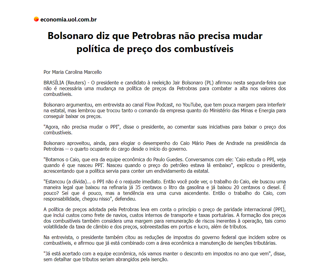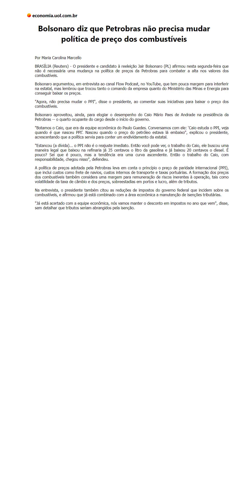 Bolsonaro diz que Petrobras não precisa mudar política de preço dos combustíveis