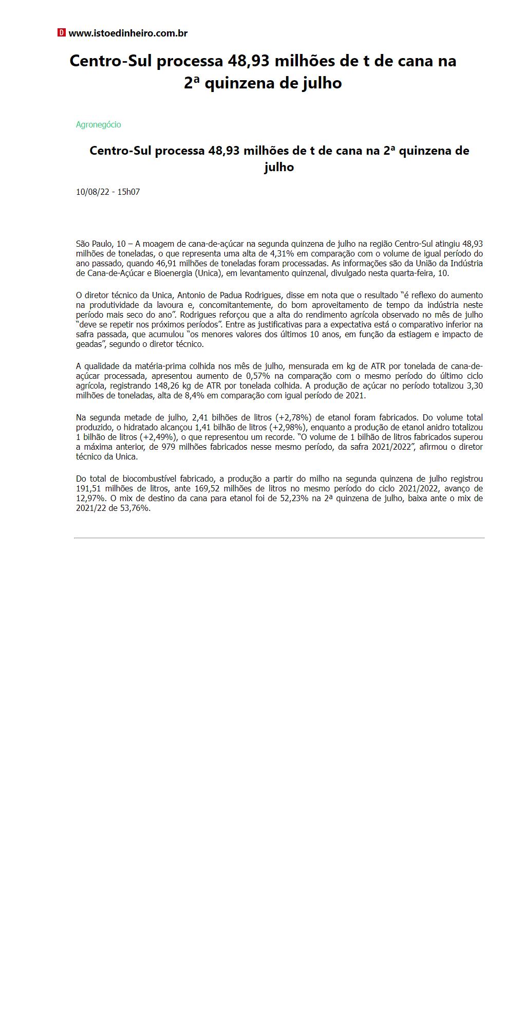 Centro-Sul processa 48,93 milhões de t de cana na 2ª quinzena de julho