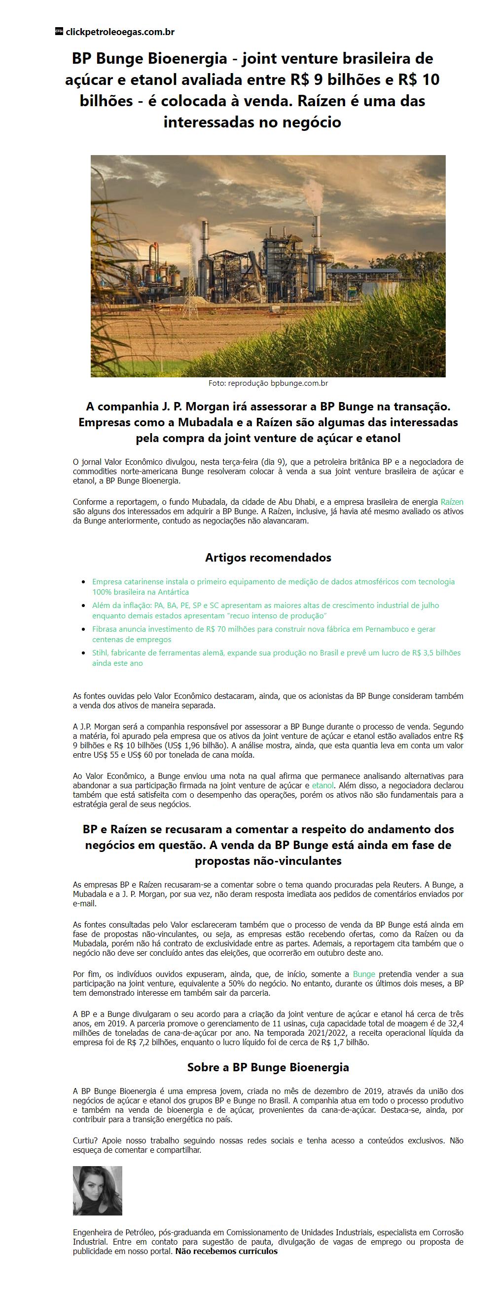 BP Bunge Bioenergia - joint venture brasileira de açúcar e etanol avaliada entre R$ 9 bilhões e R$ 10 bilhões - é coloca