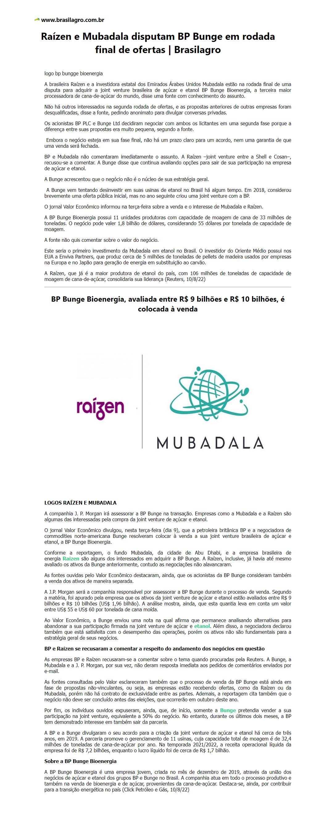 Raízen e Mubadala disputam BP Bunge em rodada final de ofertas