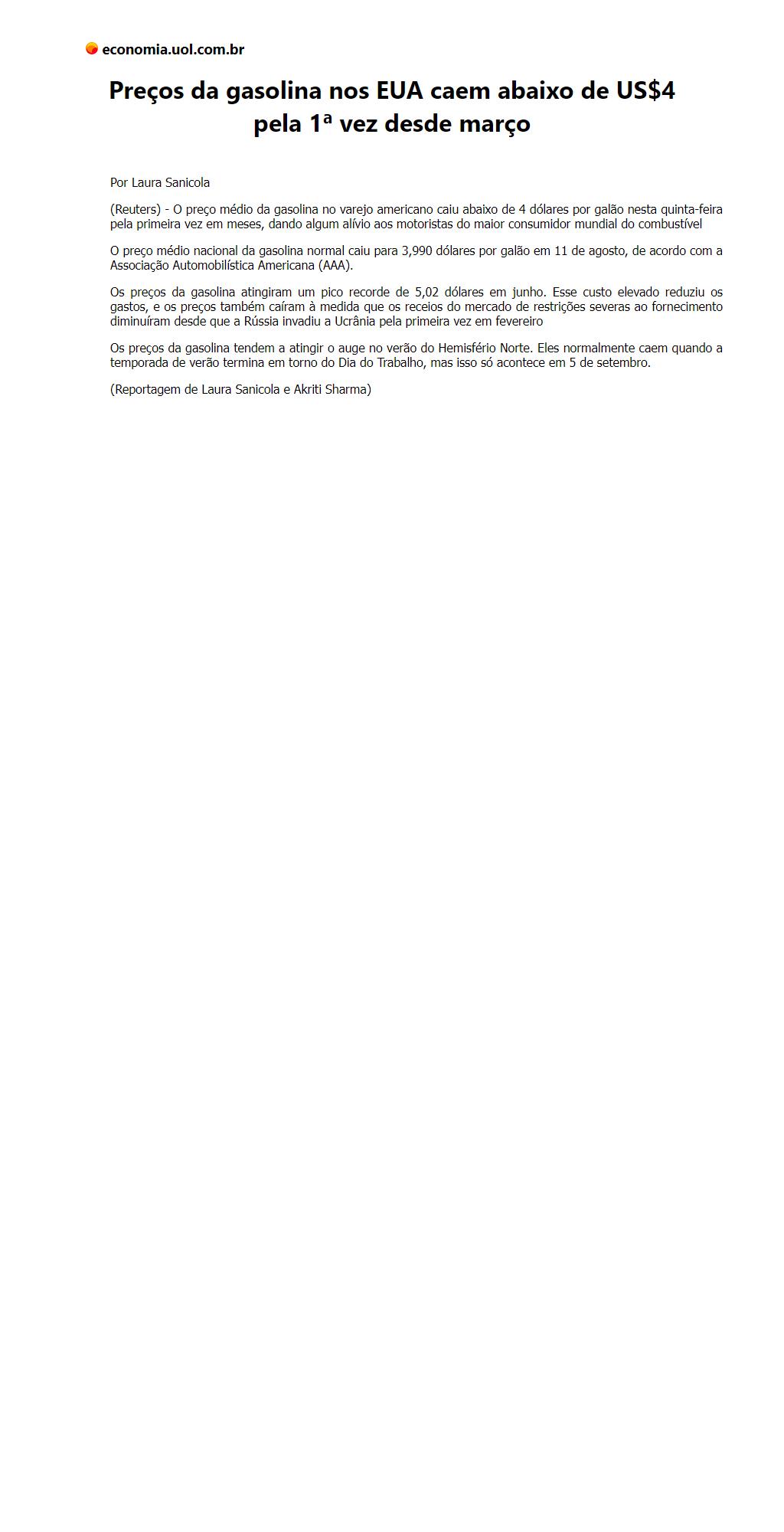 Preços da gasolina nos EUA caem abaixo de US$4 pela 1ª vez desde março