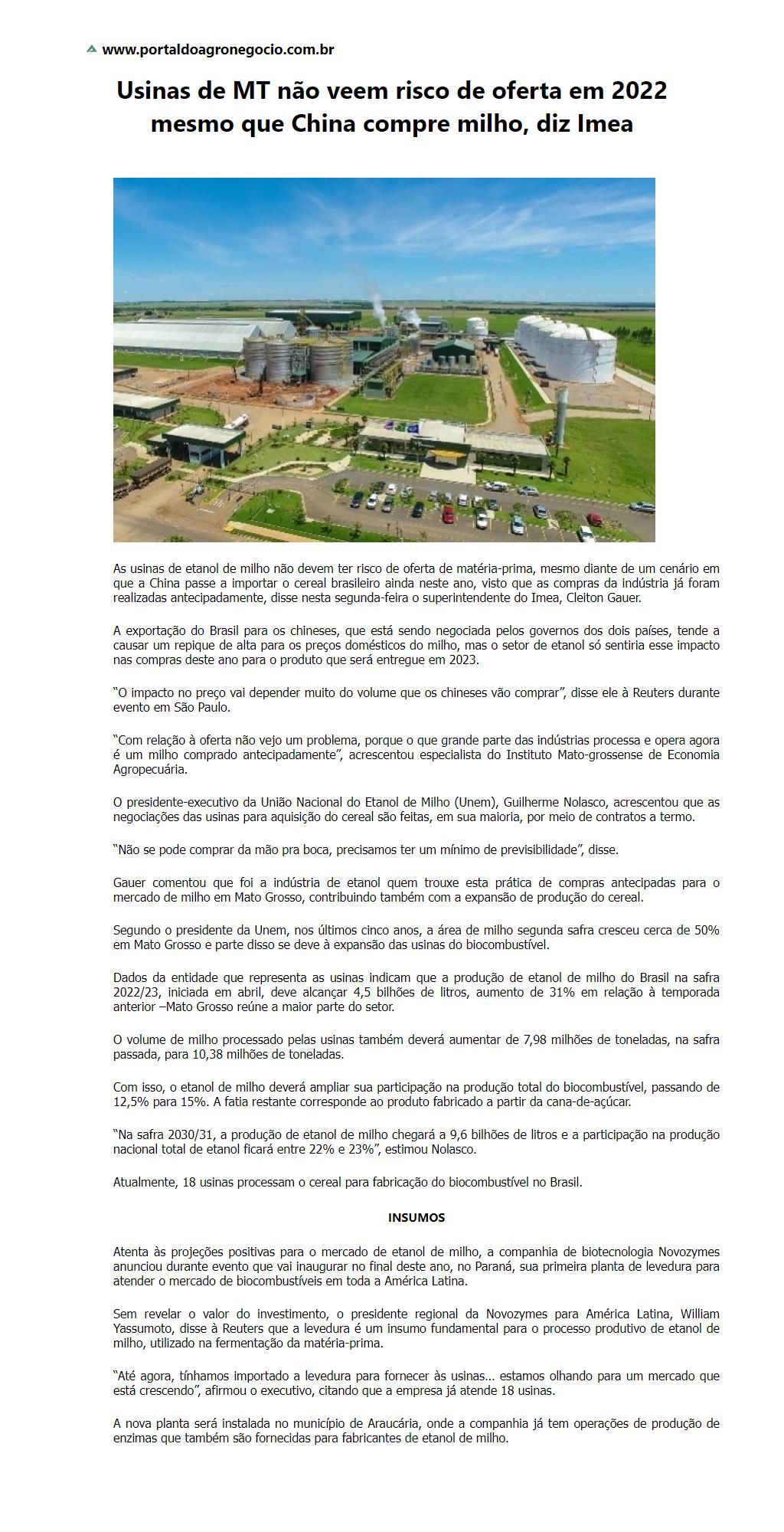 Usinas de MT não veem risco de oferta em 2022 mesmo que China compre milho, diz Imea