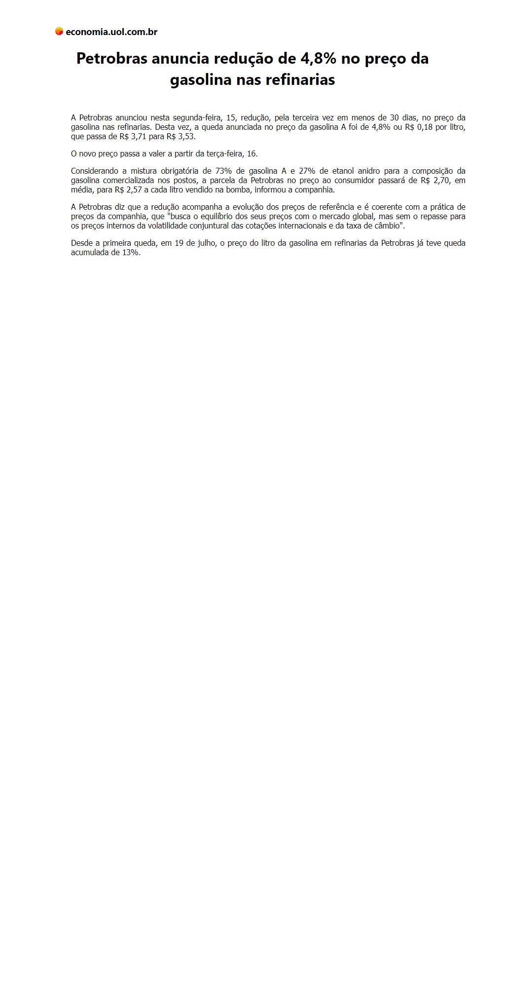 Petrobras anuncia redução de 4,8% no preço da gasolina nas refinarias