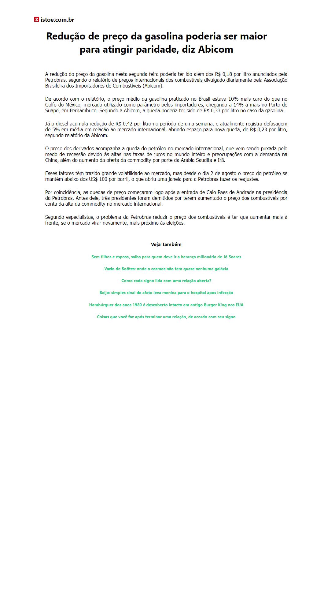 Redução de preço da gasolina poderia ser maior para atingir paridade, diz Abicom