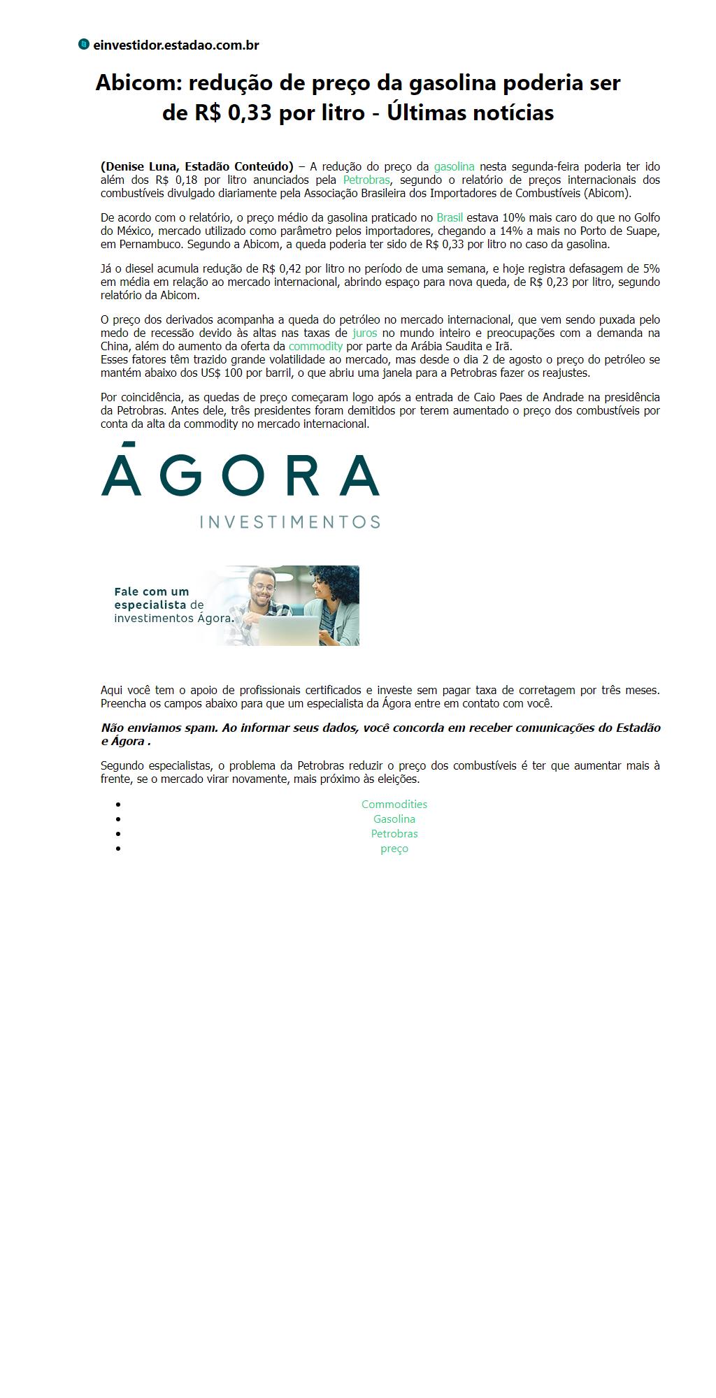 Abicom: redução de preço da gasolina poderia ser de R$ 0,33 por litro