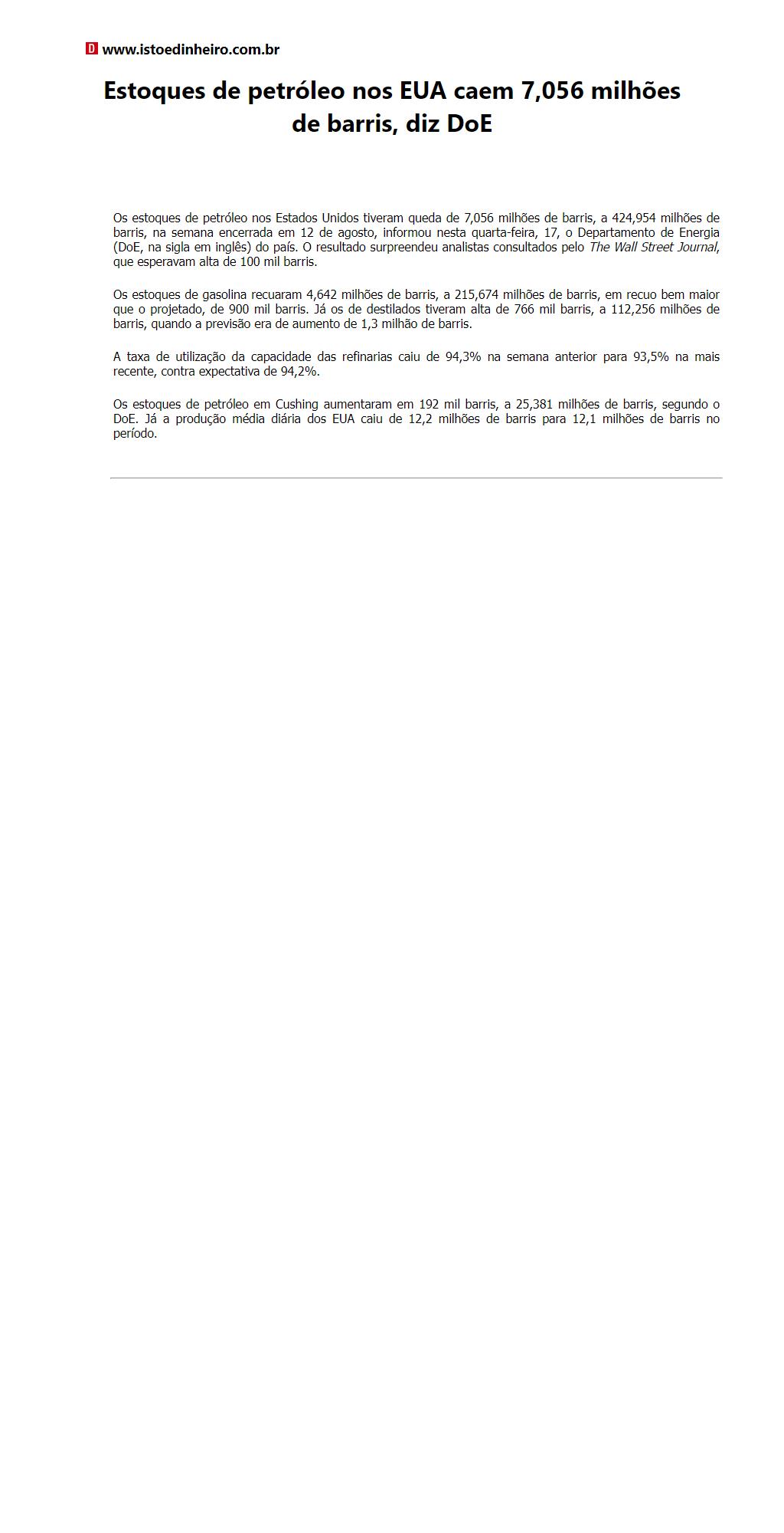 Estoques de petróleo nos EUA caem 7,056 milhões de barris, diz DoE