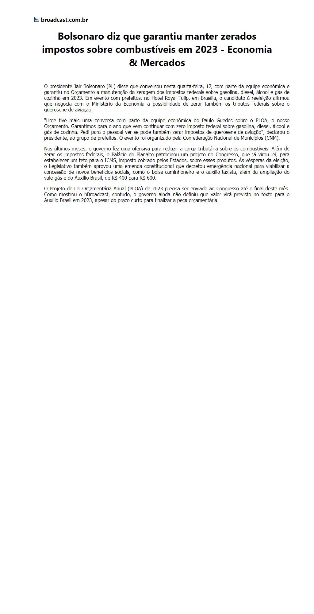 Bolsonaro diz que garantiu manter zerados impostos sobre combustíveis em 2023