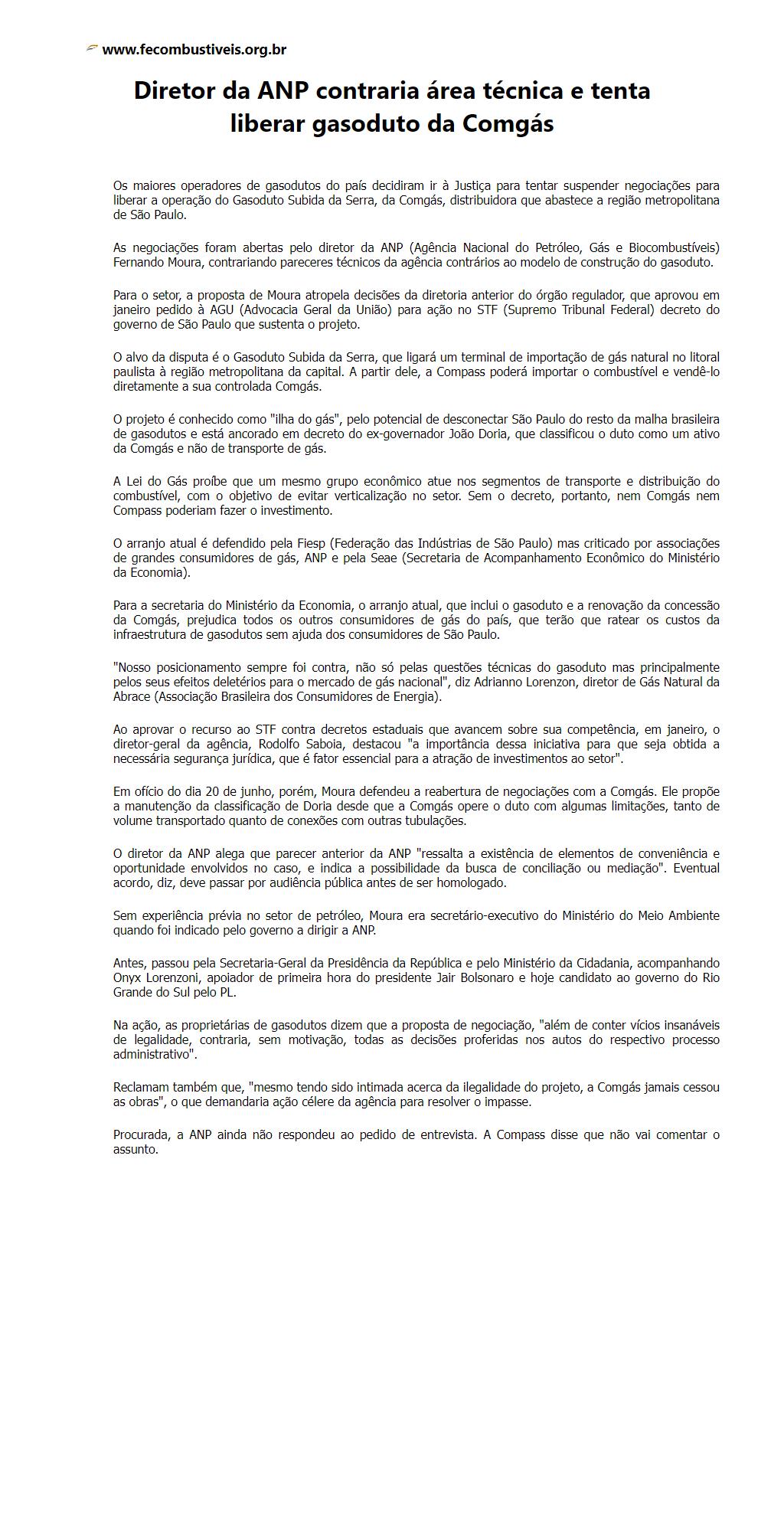 Diretor da ANP contraria área técnica e tenta liberar gasoduto da Comgás