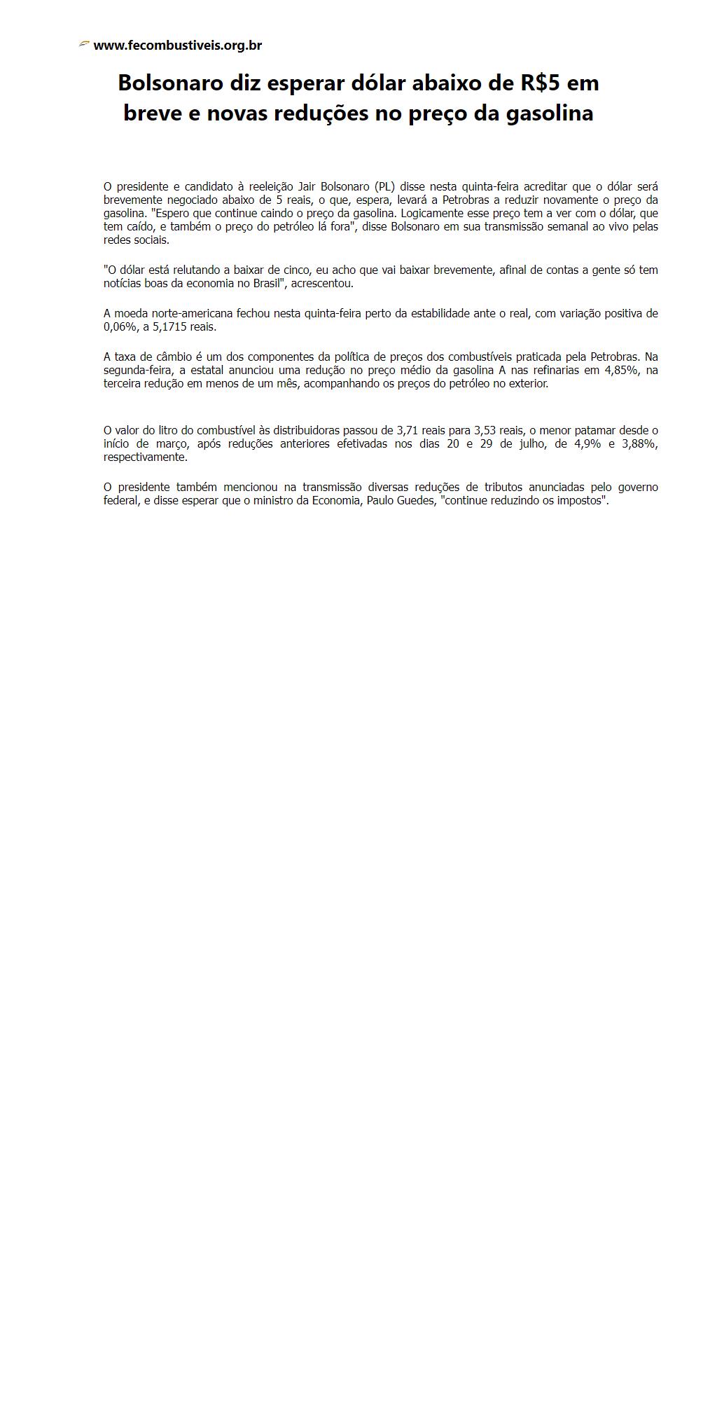 Bolsonaro diz esperar dólar abaixo de R$5 em breve e novas reduções no preço da gasolina
